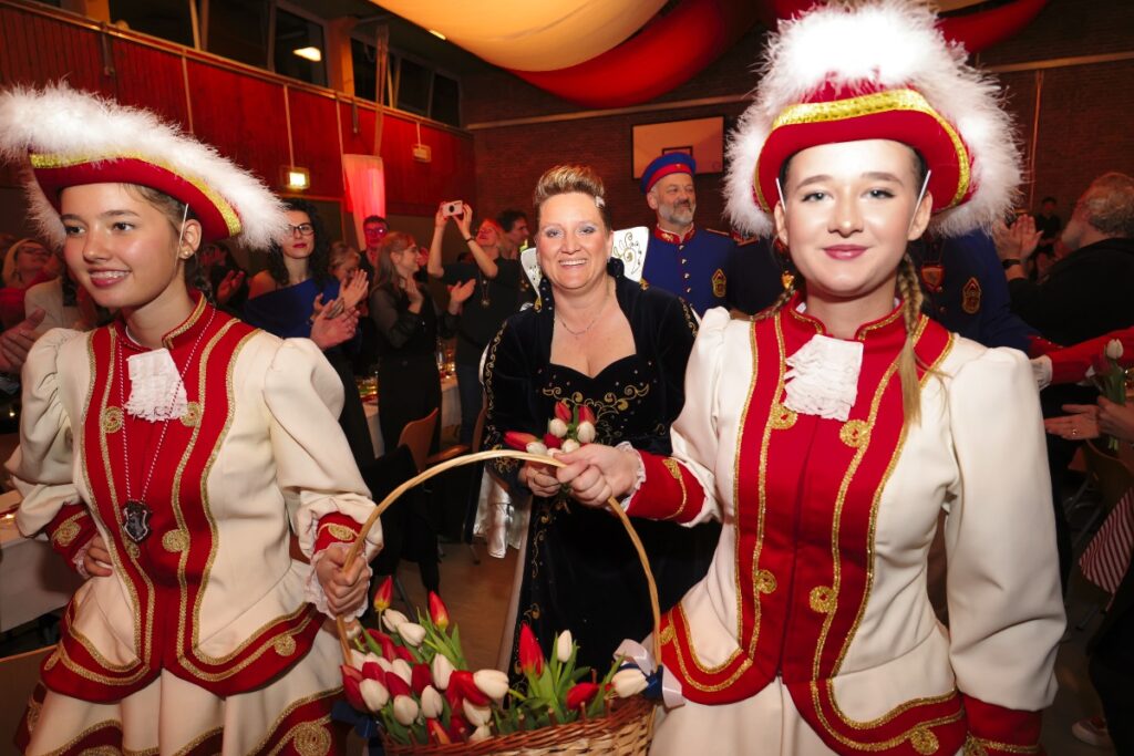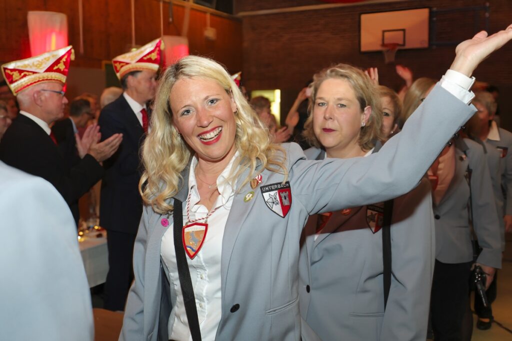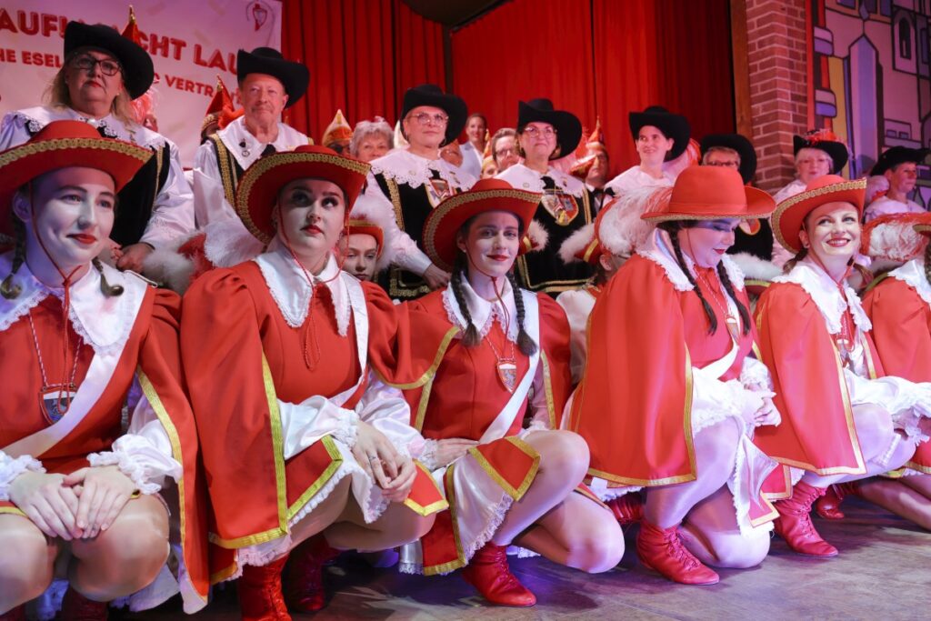 Dann nahm der Elferrat seine Plätze ein. Auf der Bühne begann das Programm mit Boris Müller und seiner Hommage an die „Doof Nuss“ Hans Hachenberg. Die vereinseigenen Tanzgarden Weiß-Rot und Rot-Weiß folgten mit ihren Gardetänzen. Während der Tänze holte der Elferrat im Hintergrund Rot-Weiße Pompons heraus und zeigte sich sehr talentiert im Anfeuern. Acht Damen hatten hier an diesem Abend erstmals ihren Platz eingenommen und präsentierten ihre neuen Herold-Uniformen. Weiter ging es mit Stimmenimitator und Parodist Jörg Hammerschmidt. Auf ihn folgte Feuerwehrmann Kresse, der an diesem Abend nicht aus Brandschutzgründen, sondern für die Unterhaltung der Gäste geladen war. Bevor das Trompetenkorps Eefelkank auf die Bühne kam, wurde gemeinsam das Mottolied gesungen. Bis tief in die Nacht ging die Party weiter und es wurde ausgelassen gefeiert.