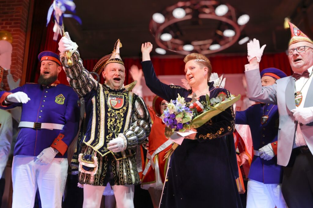 Dann kamen mit großem Gefolge in Trippelschritten – das designierte Prinzenpaar Prinz Robert I. mit seiner Prinzessin Anita II. – in den Saal. Gleich drei Einmärsche mussten von der Technik gespielt werden, bis es das Prinzenpaar auf die Bühne geschafft hatte. Roland Beckers, Präsident des Karnevalsausschuß Unterbach 1957 e.V., stellte die beiden kurz vor, bevor er ihnen Zepter und Blumen zum Zeichen ihrer Macht verlieh und sie zum 67. Prinzenpaar in der 70. Session kürte. „Steht auf! Macht laut! Närrische Esel bunt und vertraut!“ lautet das Motto der beiden.