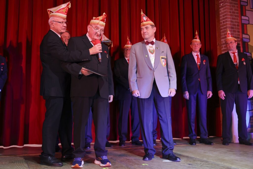 Anschließend führte ein Mann mit Helm und Kettenhemd die Ehrenritter auf die Bühne. Ordensverleihung! Sprecher Robert Homrich machte es richtig spannend, bis sich schließlich Stephan Theisen als 37. Ordensträger der Ehrenritter herauskristallisierte. Ausgezeichnet wurde er für sein Engagement im Verein.