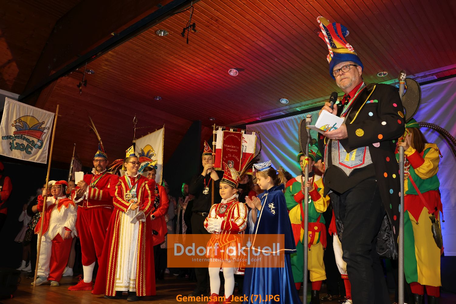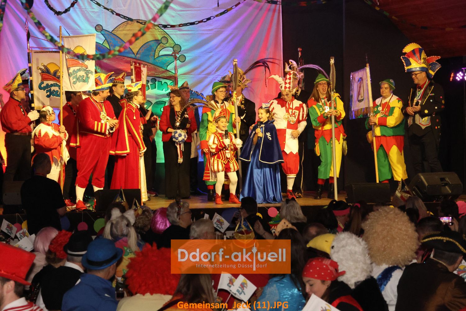 So hatten sich auch diesmal viele gut gelaunte Gäste im Gemeindesaal der Griechisch-orthodoxen Kirchengemeinde eingefunden und die Stimmung war bereits bestens, als Hoppeditz, Vorstand, und Prinzenpaar auf die Bühne zogen. Anlässlich des Jubiläums wurden sie dabei von Abordnungen vieler befreundeter Vereine begleitet. Ein aufregender Moment für das Prinzenpaar von Gemeinsam Jeck, Prinz Christian I. und Venetia Verena. Denn bei ihrer Begrüßungsrede waren alle Augen auf sie gerichtet. Doch das meisterten sie grandios, wie auch anschließend das Kinderprinzenpaar der Düsseldorfer Originale, Prinz Kurt und seine Venetia Edda, die mit ihrem Sessionslied „Prinz mit „K““ den Saal rockten.