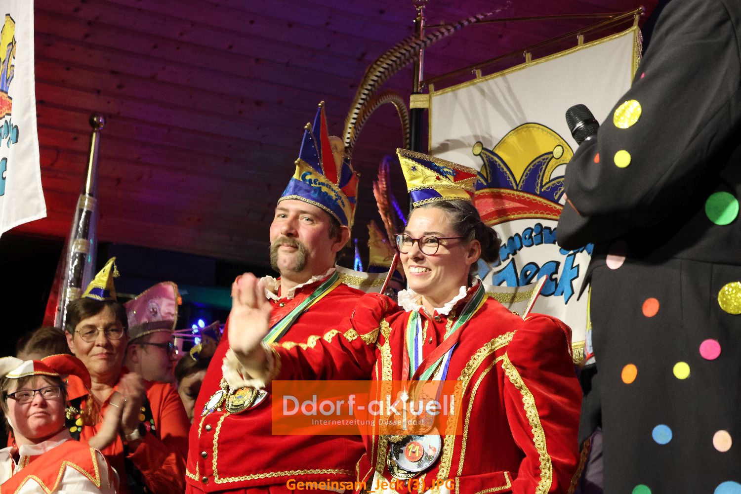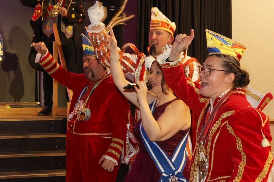 Die erste Polonäise rollte danach durch den Saal, da war Heinz Hülshoff noch nicht bei der zweiten Strophe seines ersten Liedes angekommen. Heinz ist langjähriger Unterstützer des Vereins und die Mitglieder lieben ihn. Als alle wieder auf ihre Plätze erreicht hatten, hieß es sich mit Fähnchen auszustatten, um dem Prinzenpaar der Stadt Düsseldorf, Prinz Marcus I. und Venetia Nicole, einen gebührenden Empfang zu bereiten. Die beiden hatten bereits die Kürung von Prinz Christian I. und Venetia Verena beim Jubiläumsempfang am 13. November mitgefeiert und sich über deren Gegenbesuch bei der ihrer Kürung einen Tag später gefreut. Gemeinsam wollten sie dann das Sessionslied von Marcus und Nicole anstimmen, doch was war das? Die Musik, die erklang, war die von Andreas und Evelyn aus der vergangenen Session! Ein großer Lacher, aber dann kam die richtige Musik und die Prinzenpaare sangen das Lied gemeinsam.