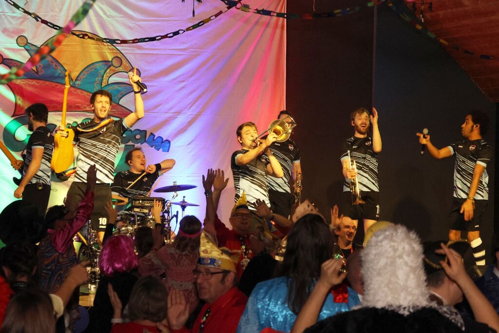 Mit der Wimmer Band, den Swinging Funfares, der Rhythmus-Sportgruppe und der KG Regenbogen hielt das Programm noch viele musikalische Highlights bereit. Sie alle rockten den Saal und die Gäste tanzten und sangen ausgelassen mit. Doch zwischendurch waren es verschiedene Gruppen, die auf der Bühne ihre Tänze präsentierten und dafür gefeiert wurden. Da waren die Jecken Dancer, die bereits seit acht Jahren den Verein bereichern. Sie zeigten ein Medley ihre Tänze der vergangenen Jahre und wurden nicht ohne Zugabe von der Bühne gelassen. Die erste Rakete des Abends wurde für sie gestartet.