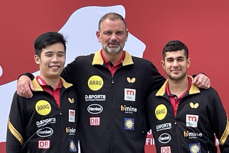 Die Revanche ist gelungen: Während Li Yongyin (links) nicht punkten konnte, war Kanak Jha (rechts) mit zwei Siegen der erfolgreichste Spieler der Borussia am Samstag, in der Mitte Trainer Danny Heister
