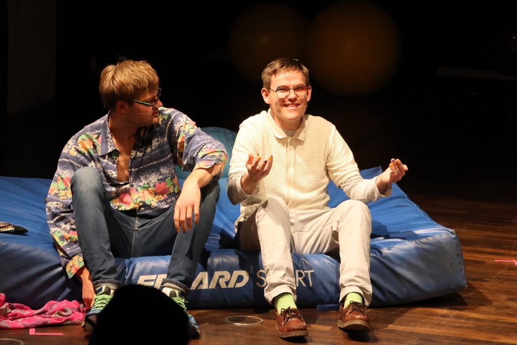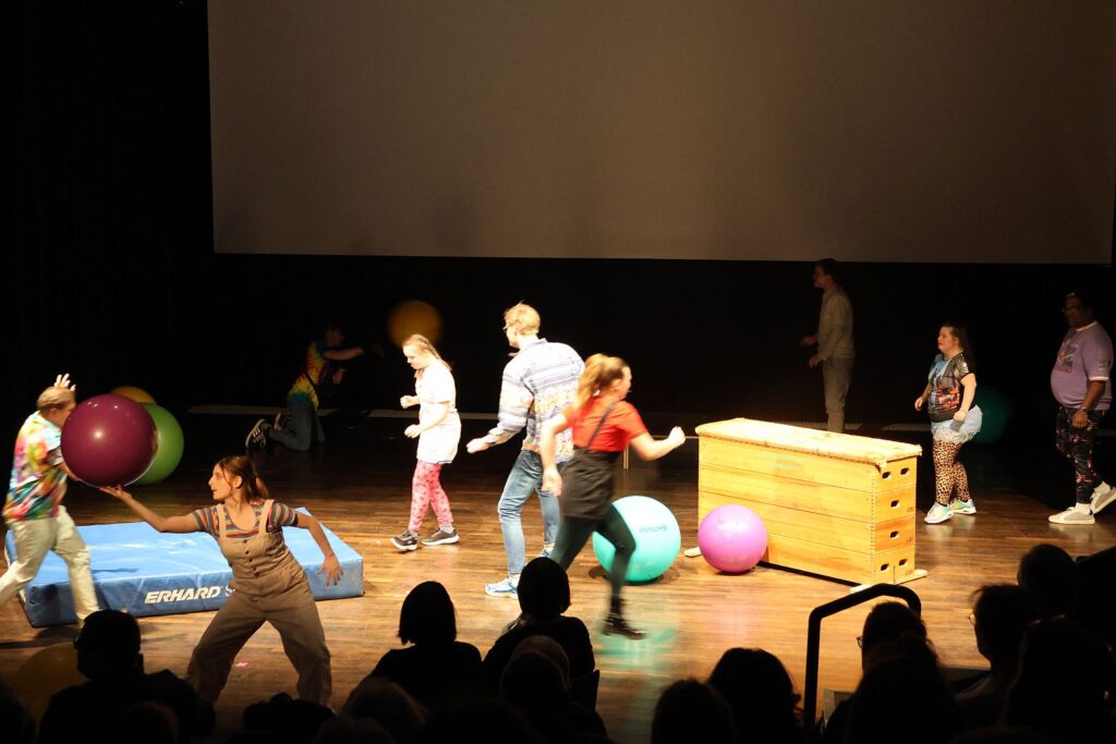 Ein großes Bühnenbild brauchten die Schauspieler*innen nicht. Da gab es eine Weichbodenmatte, einen Sprungkasten und einige Pezzibälle, die in der ersten Szene in die Sporthalle einer Schule führten. Aber auch anschließend reichten sie, um in die verschiedensten Spielorte zu führen.