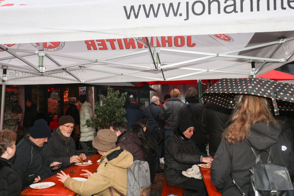 Und dann brutzelte Scholljonges Baas Michael Brühl um 10 Uhr die ersten Reibekuchen. Unterstützt wurde er unter anderem durch Axel Bellinghausen, der ebenfalls Mitglied der Tischgemeinschaft ist. Die große Pfanne wurde viele Male gefüllt, denn insgesamt wurden rund 3000 Stück ausgeben. Brühl: „Wir sind stolz auf die breite Beteiligung der Jonges und freuen uns darauf einen Beitrag zur gelebten Nachbarschaft und Verantwortung in unserer Stadt zeigen zu können.“