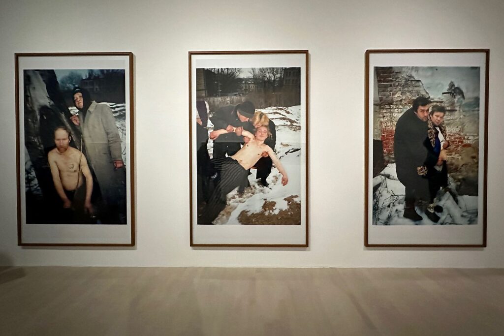 Gewiss. Aber der Faden der Erzählung kann in dieser Ausstellung schon mal verloren gehen. Ganz woanders spielt die Fotografie, die Andreas Gursky 2023 bei der Räumung des Protest-Camps in „Lützerath“ gemacht hat. Wie seltsame Vögel hängen die Baumhäuser der Aktivisten in kahlen Zweigen. Um die Ecke wird Chris Reinecke erwähnt, die nach 1968 gegen Mietwucher protestierte und den Hofgarten zum Gemüsegarten erklärte. Auf der anderen Seite des Raums verweisen frühere Bilderserien des heute 87-Jährigen Fotografen Boris Mikhailov auf die bittere Armut hin, die sich nach der Lösung von der Sowjetunion in der Ukraine entwickelte. Sein „Requiem“ aus den späten 1990er-Jahren mutet in der heutigen Situation, mitten im russischen Angriffskrieg, etwas seltsam an.