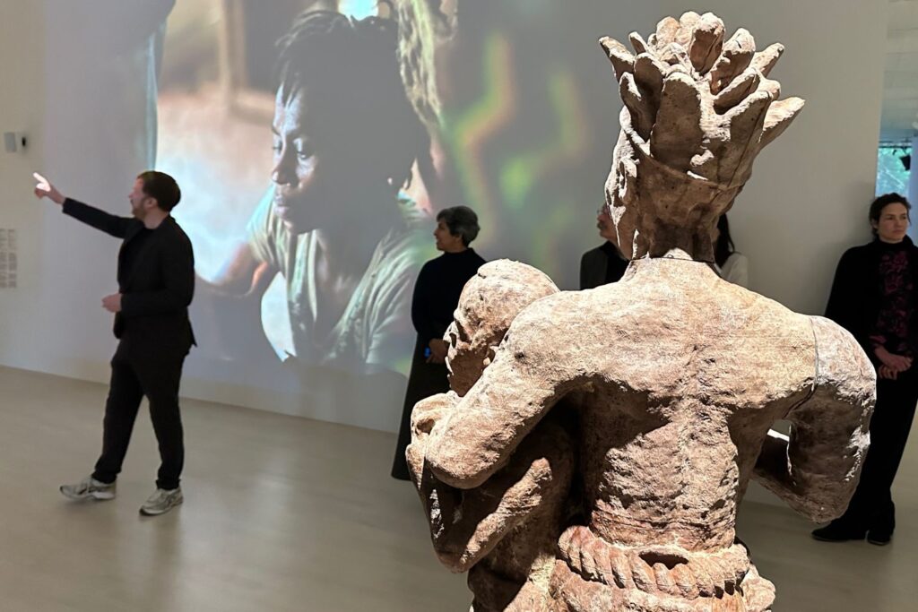 Bis zum Frühjahr wird das skulpturale Gebäude die Spaziergänger überraschen und den Blick für andere Lebenswelten öffnen. Zum Beispiel für einen auf die Wand im Souterrain projizierten Wald in Sri Lanka, der nach einem blutigen Bürgerkrieg zwischen dem Staat und tamilischen Freiheitskämpfern gesperrt wurde. Christopher Kulendran Thomas, dessen Familie vor der eskalierenden Gewalt fliehen musste, hat die Naturidylle nun mit KI rekonstruiert. Seine optisch beeindruckende Videoinstallation „The Finesse“ lässt auch Influencerin Kim Kardashian zu Wort kommen, mit einer ebenfalls künstlich generierten, also gefälschten Stellungnahme: „Nichts kann dich beschützen, wenn das Narrativ gegen dich ist.“