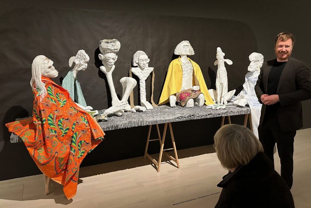 Poesie aus Styropor: die „Sieben Schläfer“ der deutsch irakischen Bildhauerin Lin May Saeed. Rechts freut sich Kurator Kolja Reichert. Foto: bikö
