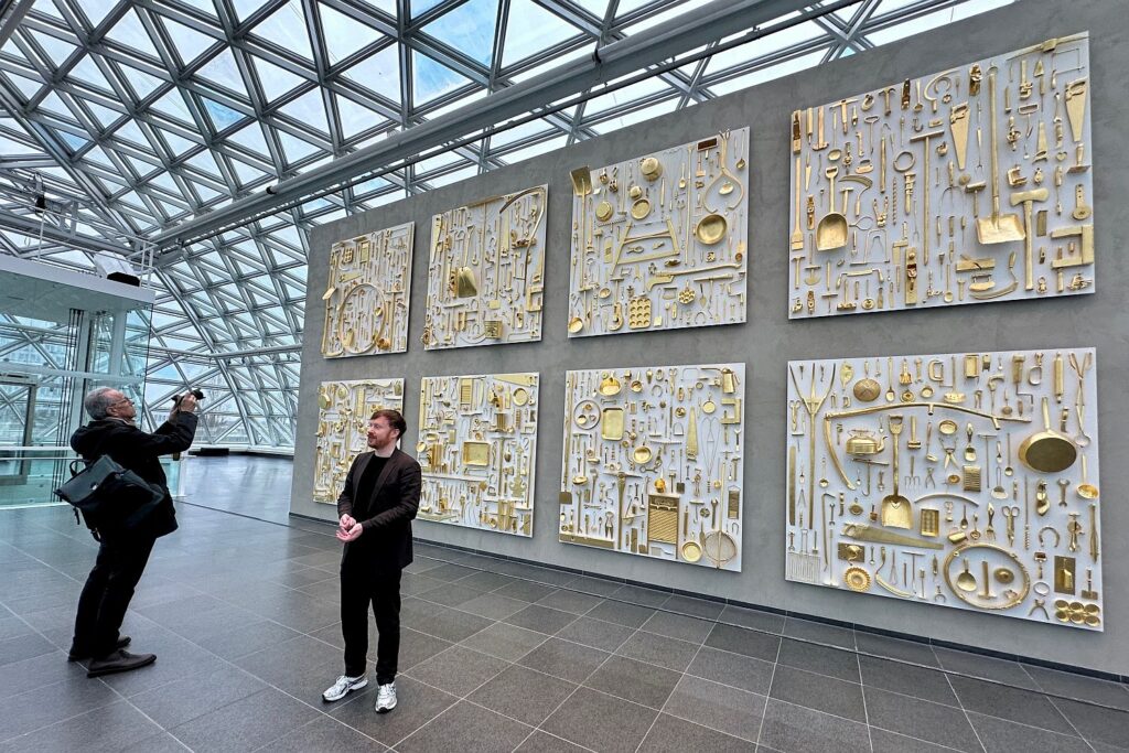 Aus vergoldetem Werkzeug wurde „Das Alphabet meiner Mütter und Väter“ konstruiert. Kurator Kolja Reichert vor Paneelen des Schweizers Ugo Rondinone. Foto: bikö