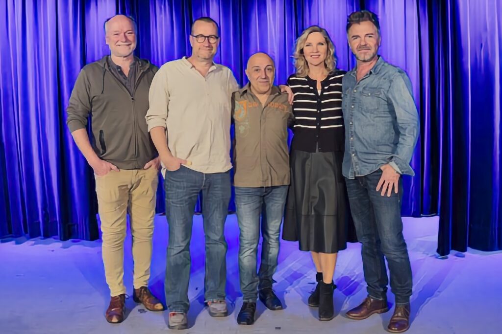 Gruppenbild des Ensembles (von links): Martin Maier-Bode, Daniel Graf (der bis Februar aussetzt), Grafs Vertreter Massimo Tuveri, Susanne Pätzold und Heiko Seidel. Foto: Kom(m)ödchen Düsseldorf