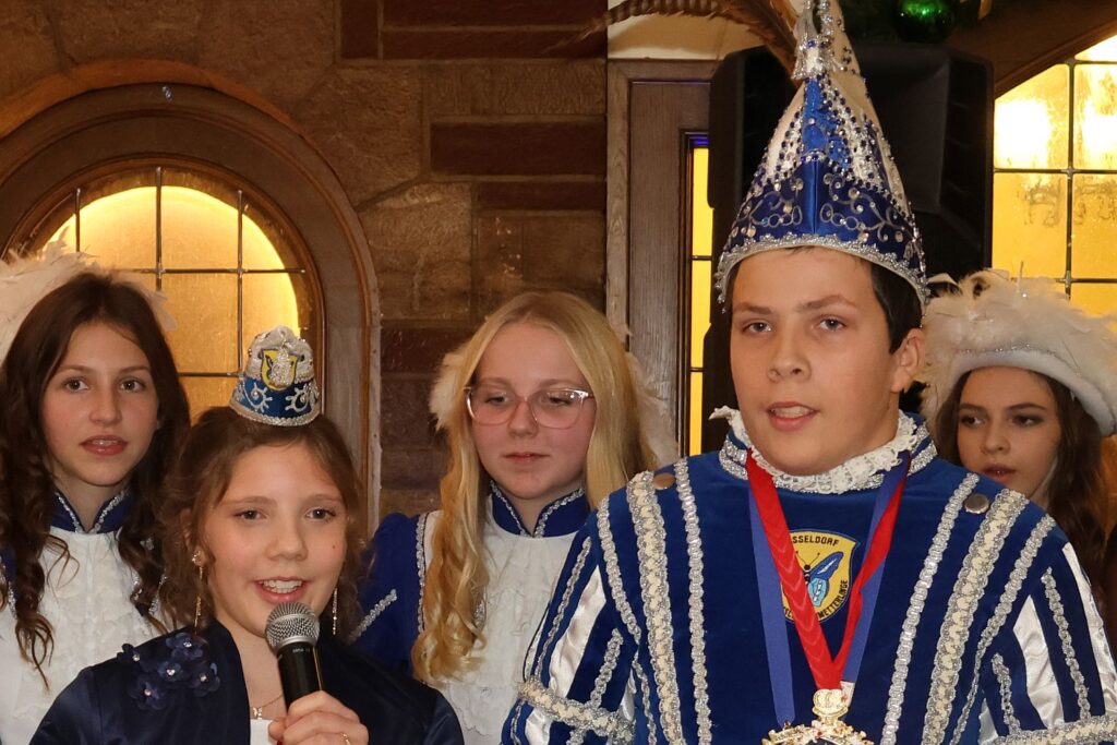 Dann war der große Moment für das Kinderprinzenpaar der Schmetterlinge gekommen. Zwar hatten sie mit Kinderhoppeditzerwachen und anderen Veranstaltungen bereits ungekürt schon Erfahrungen als Tollitäten gesammelt, aber am Sonntag gab es dann endlich die Federn an die Kappe des Prinzen Alexander und die Pritschen. Venetia an seiner Seite ist seine Schwester Charlotte. Für ihre Rede gab es ein dreifaches Helau und nun kann die Session im Januar für sie so richtig starten.