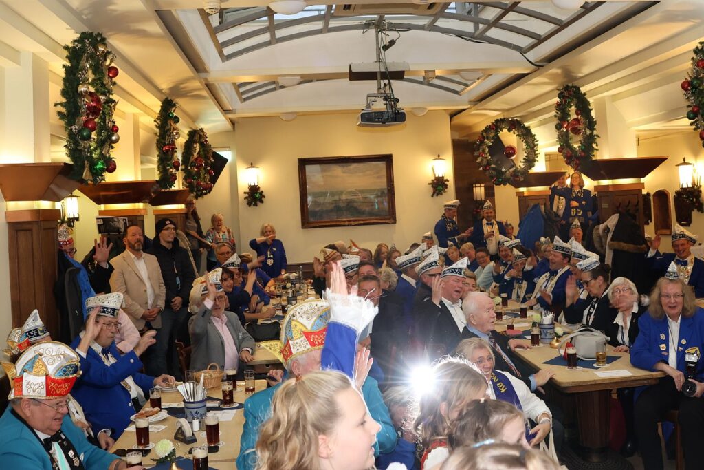 Die Närrischen Schmetterlinge haben ihren eigenen Terminplan. So gestalten sie die letzte Karnevalsveranstaltung im November und an Neujahr, mit der Vorstellung des Dreigestirns, die erste des neuen Jahres. Während sich am Sonntag (30.11.) in der Innenstadt die Besucher*innen beim verkaufsoffenen Sonntag und auf den Weihnachtsmärkten tummelten, wurde es im Saal des Schlüssels „besinnlich“ bei der Weihnachtsfeier der Schmetterlinge. Wirklich? Nein, wer Kurt Fenn kennt, der weiß, dass neben viel Tanz und Spaß auch die Kürung des Kinderprinzenpaars mit viel Helau gefeiert wurde. Allerdings gab es auch einen großen weihnachtlichen Geschenketisch.
