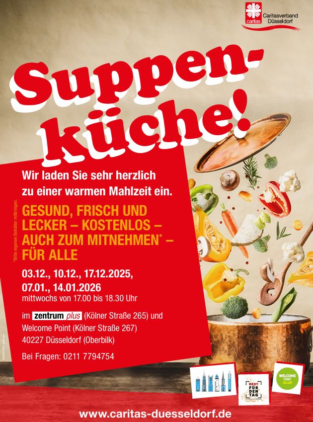 In Oberbilk im Caritas Zentrum Plus, Kölner Straße 265 und gleich nebenan im Welcome Point an der Kölner Straße 267 wird jeden Mittwoch von 17 bis 18:30 Uhr kostenlose frischgekochte Suppe verteilt. Alle, die gerne eine leckere warme Mahlzeit in geselligem Rahmen genießen, sind herzlich eingeladen. Am Herd stehen ausschließlich ehrenamtliche Köch*innen, die frische Zutaten fleischlos und oft mit geretteten Lebensmitteln zubereiten. Die Portionen werden bei jedem Suppenküche-Termin gratis ausgeteilt. Das gemeinsame Essen soll Menschen zusammenbringen und Einsamkeit vorbeugen. Bei Bedarf erhalten die Gäste auch Rat und Hilfe zu unterschiedlichsten Lebenslagen.