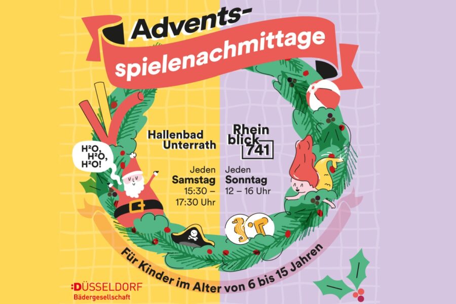 Während der Adventszeit lädt die Bädergesellschaft Düsseldorf zu Spielenachmittagen und anderen Aktionen in verschiedenen Bädern ein. Dabei gibt es an den Adventswochenenden im Gartenhallenbad Unterrath und im Rheinblick 741 Spielenachmittage mit verschiedenen Themenschwerpunkten für Kinder im Alter von 6 bis 15 Jahren.