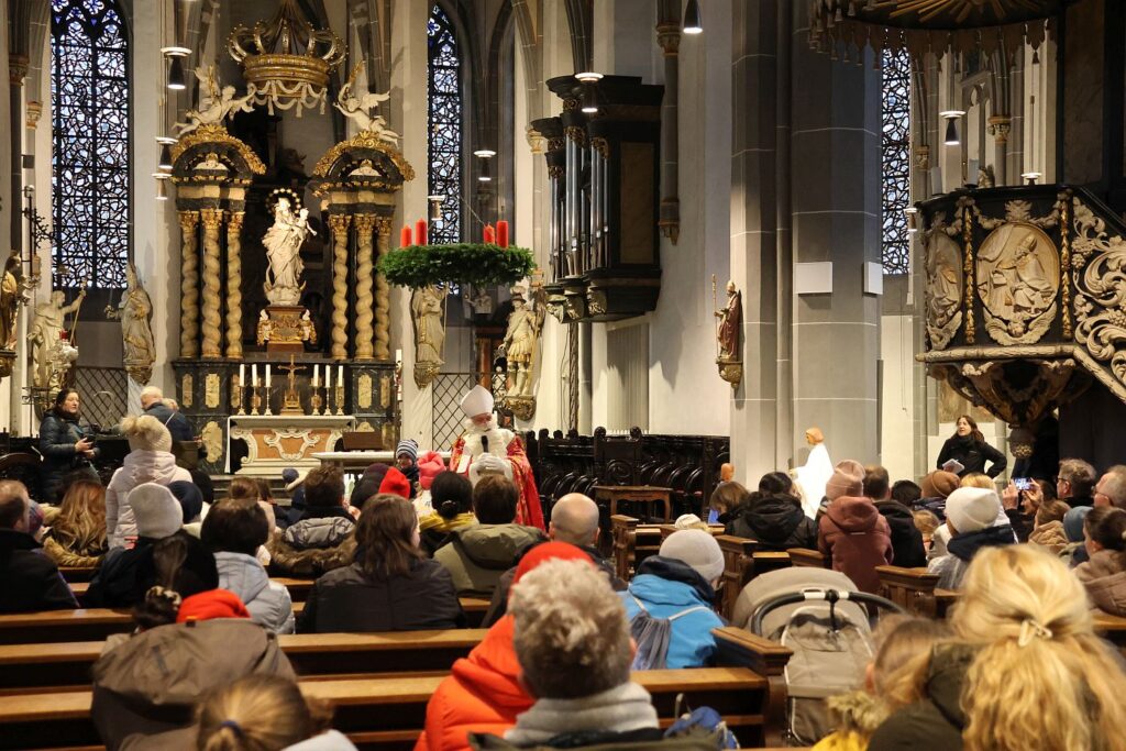 Die ganze Schar zog in Begleitung von Stadtdechant Frank Heidkamp zur Basilika St. Lambertus. Das Jugendbläser-Ensemble unter der Leitung von Sebastian Schürger unterstützte musikalisch und Pfarrer Karl-Heinz Sülzenfuß, der den Nikolaus verkörperte, erzählte den Kindern die Geschichte von heiligen Nikolaus.