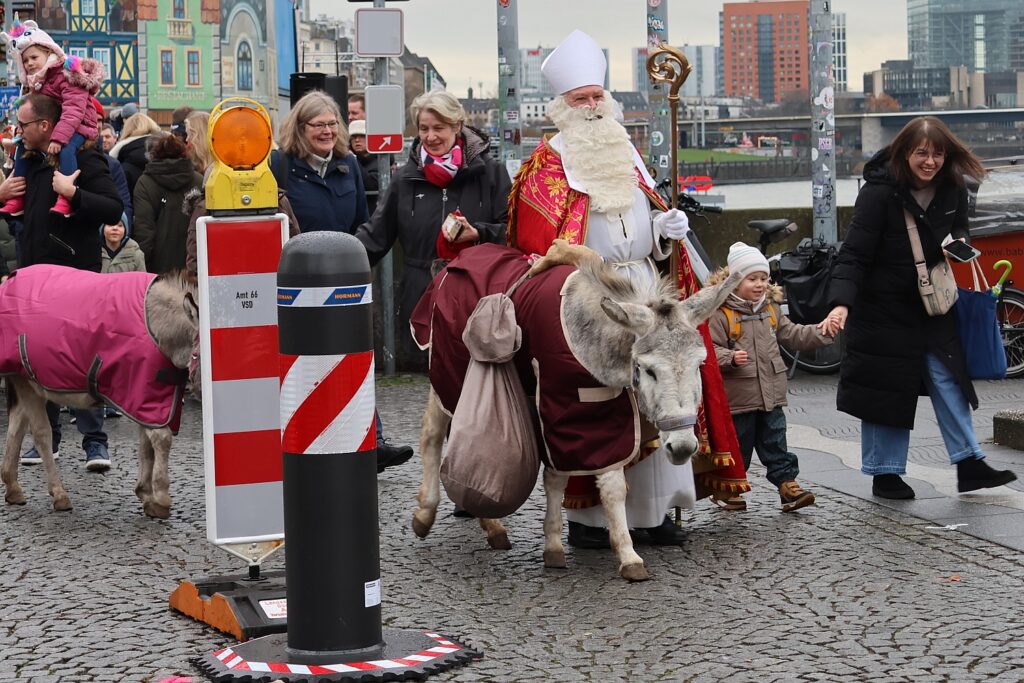 Mit dem Löschboot der Krefelder Polizei kam der Nikolaus am Samstag (6.12.) in Düsseldorf am Anleger des Burgplatzes an. Dort wurde er nicht nur von den Eseln Lilly und Jopie aus dem Eselspark Zons empfangen, auch Dutzende Kinder und ihre Eltern bereiteten dem heiligen Mann einen begeisterten Empfang. Der Heilige Nikolaus von Myra ist der Schutzpatron der Schiffer, Seeleute und Fischer, weshalb er in Düsseldorf standesgemäß mit dem Boot anreist.