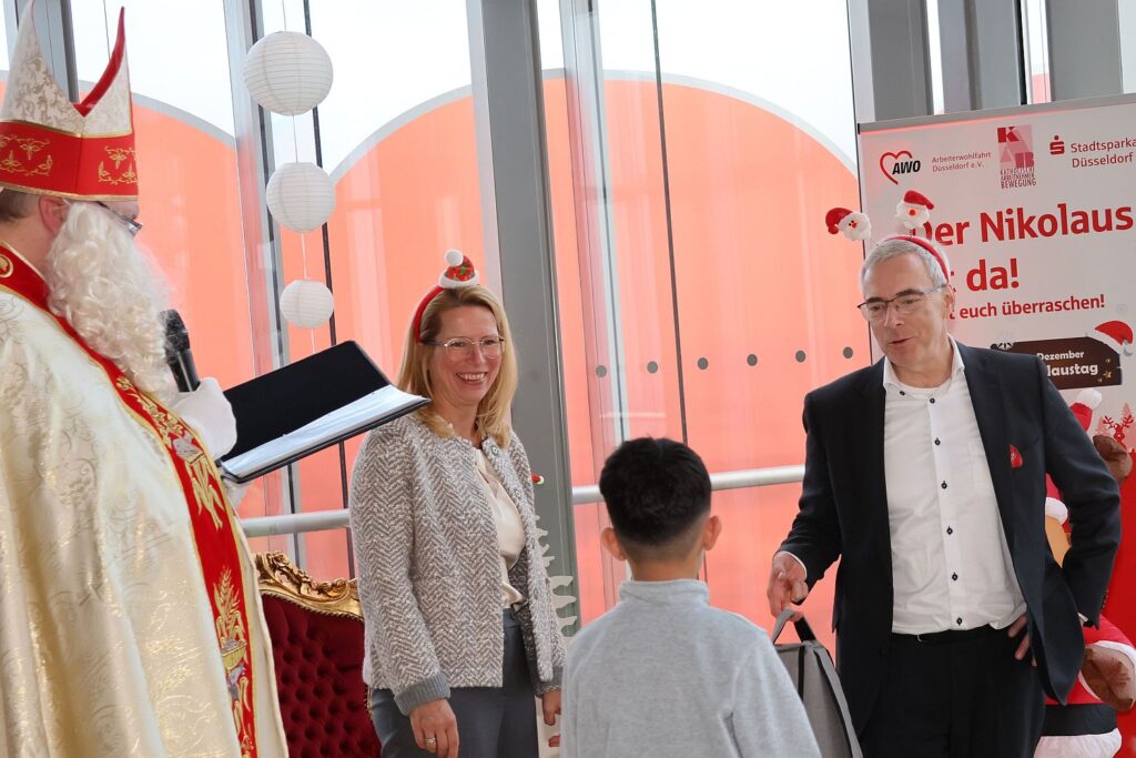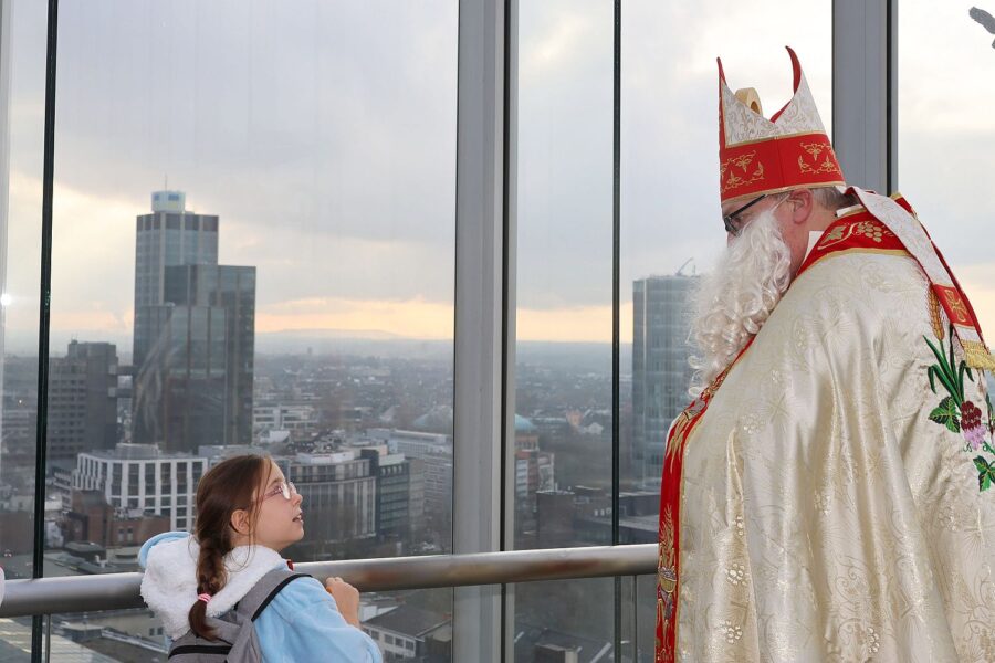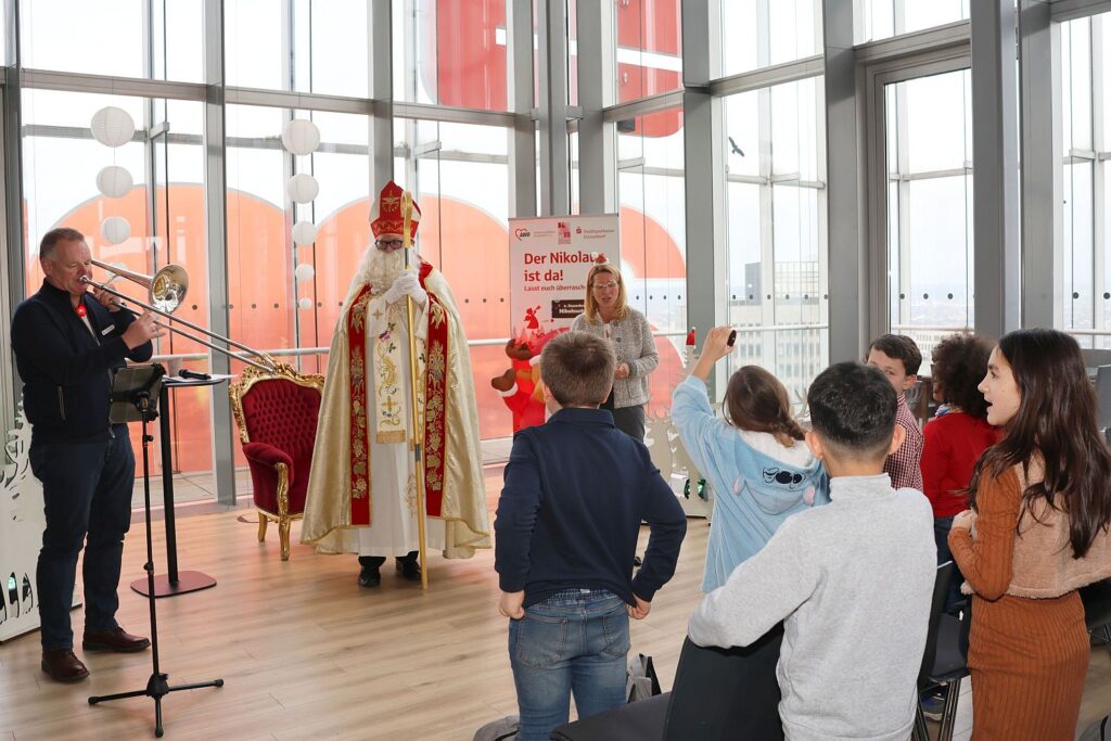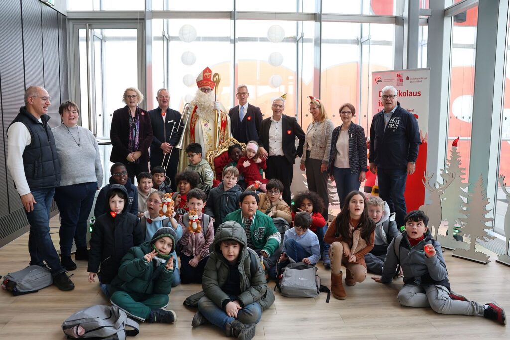 Rund 60 Meter über der Stadt besuchte der Nikolaus am Freitag (5.12.) die Zentrale der Stadtsparkasse an der Berliner Allee. Doch nicht den Mitarbeitenden galt der Besuch, sondern einer Gruppe Grundschulkinder. Denn es ist seit vielen Jahren Tradition, dass an Nikolaus der Vorstand der Stadtsparkasse und Vertreter*innen der Katholischen Arbeitnehmerbewegung (KAB) und der AWO eine OGS-Gruppe zur Nikolausfeier einladen.