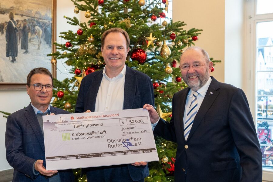 „Düsseldorf am Ruder für Menschen mit Krebs“ engagiert sich bereits seit 2025 unter dem Motto „Alle in einem Boot gegen Krebs, für das Leben“ für den gemeinnützigen Verein Krebsgesellschaft Nordrhein-Westfalen. 108 Teams erruderten am 30. August 2025 bei der neuenten Auflage der Benefiz-Regatta die stolze Summe von 50.000 Euro, die jetzt mit einem symbolischen Scheck im Rathaus übergeben wurden. Schirmherr Oberbürgermeister Dr. Stephan Keller überreichte ihn gemeinsam mit Kurt Nellessen vom Verein „Düsseldorf am Ruder e.V.“ an Dr. med. Johannes Selbach, stellvertretender Vorstandsvorsitzender der Krebsgesellschaft Nordrhein-Westfalen.