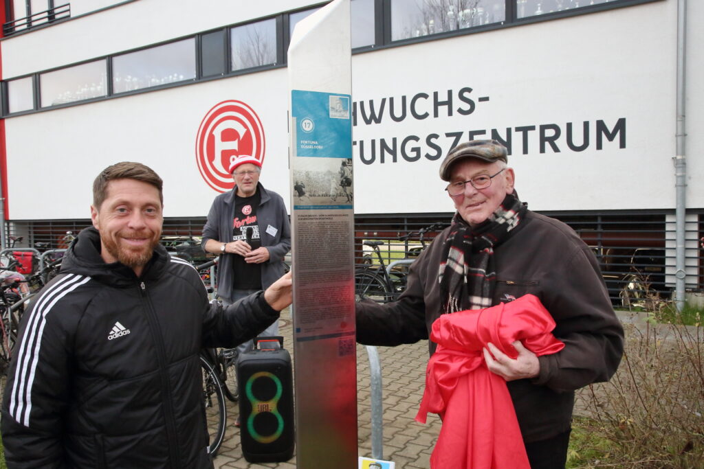 Es ist die Stele mit der Nummer 17, die der FlingerPfad am Donnerstag (11.12.) feierlich vor dem Nachwuchsleistungszentrum (NLZ) der Fortuna am Flinger Broich enthüllte. Da passte es bestens, dass der ehemalige Spieler und langjährige Kapitän mit der Rückennummer „17“ das rote Tuch von der Stele zog. Andreas „Lumpi“ Lambertz zu Ehren wird die 17 beim F95-Profi-Team nicht mehr als Rückennummer vergeben. Gemeinsam mit Lumpi weihte eine weitere Legende die Stele ein: Egon Köhnen. Der 78-Jährige spielte seit 1966 für die Fortuna und schoss 17 Tore – passte also auch.