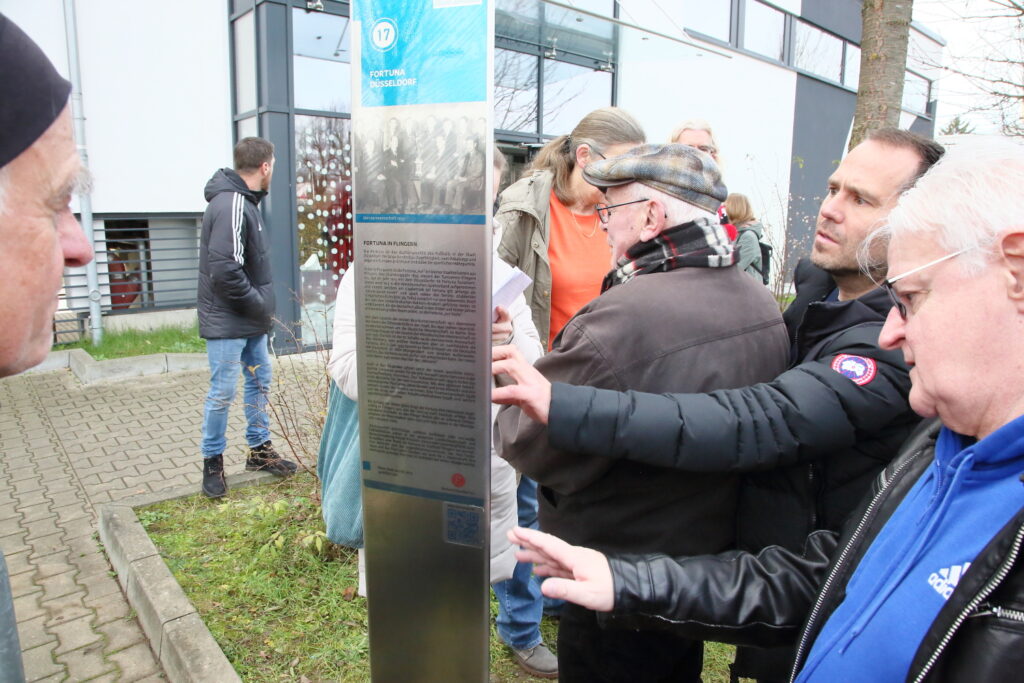 Die Stele gehört zum Rundweg des FlingerPfads, der an 30 Stationen die Geschichte des Stadtteils von der Mitte des 19. Jahrhunderts an nacherzählt. Bis auf fünf Stationen sind bereits alle mit Edelstahlstelen versehen, die über das Zeitalter der Industrialisierung berichten, in deren Folge Flingern und die angrenzenden Stadtteile als Industriestandorte und Wohnorte der Arbeiterfamilien entstanden sind. Am Flinger Broich geht es natürlich um die Fortuna, die in diesem Jahr ihren 130. Geburtstag feiert. Auf einen Ausflug in die Geschichte des Vereins, nahmen Thomas Bernhardt und Friedie Schacht die Einweihungsgäste mit. Beide gehören der Fortuna-Geschichts AG an. Der Düsseldorfer Turn und Sportverein Fortuna 1895 e.V. ist heute das bestimmende Fußballteam in Düsseldorf, aber die Ursprünge begannen als „Kleine Leute Verein“, erfuhren die Zuhörer*innen.