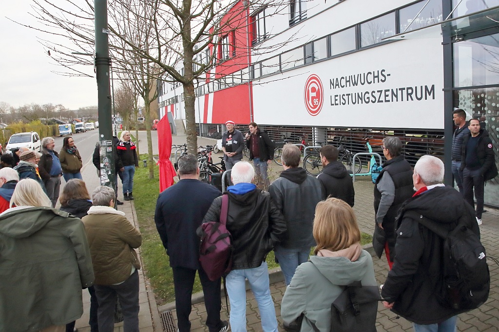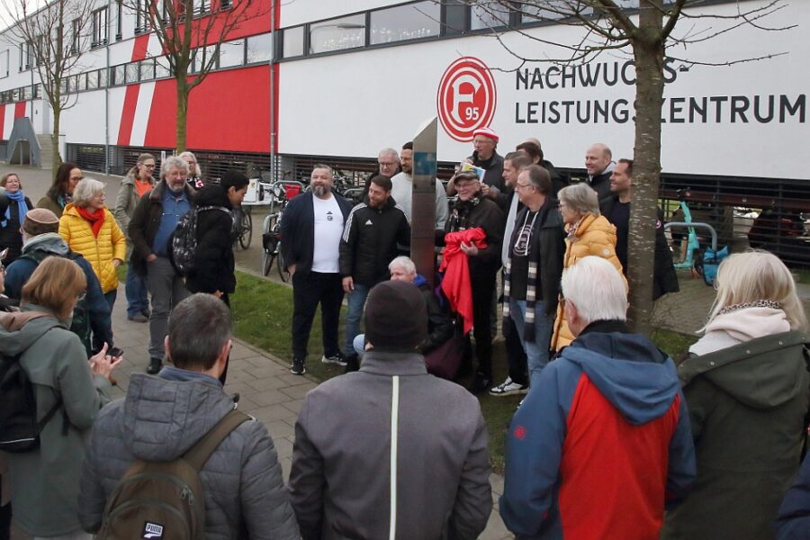 Aber in Flingern ist die Fortuna fest verwurzelt mit dem Jugendleistungszentrum, dem Toni-Turek-Haus und dem Paul-Janes-Stadion, wo auch die 2. Mannschaft ihre Heimspiele austrägt. So freute sich Kaspar Michels vom FlingerPfad und bekennender Fortuna-Fan besonders über die Einweihung dieser Stele, die auch von Fortuna Düsseldorf gestiftet wurde. Gesetzt wurde sie von den Gartenbauer*innen der gemeinnützigen Jugendberufshilfe JBH Düsseldorf. Die JBH war auch mit zahlreichen Jugendlichen zur Einweihung der Stele gekommen. Und auch die Fortuna denkt darüber nach, den Nachwuchsspieler*innen mehr über die Geschichte des Vereins zu informieren. Drei Aufsichtsratsmitglieder und das Team des NLZ war am Donnerstag dabei, eine Wertschätzung, die das Team des FlingerPfads zu schätzen weiß.