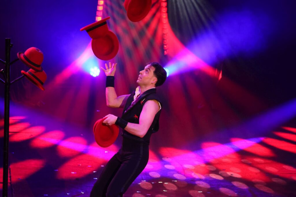 Charmant und fingerfertig zeigte Sage Macaggi, dass man einen Hüte nicht nur auf dem Kopf tragen kann. Bis zu sechs Hüte jonglierte er mit Geschicklichkeit und Präzision durch die Luft.