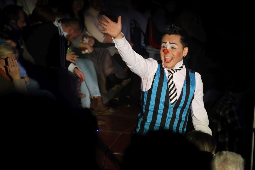 Ein gelungener Einstieg ins Programm, das rasant weiterging. Denn auch als in der Manege das Trapez für Steven Ferreri aufgbeaut wurde, bekam davon kaum jemand etwas mit, denn Clown David Marquez streifte durch Publikum, auf der Suche nach willigen Menschen. Von denen führte er zwei in die Manege und integrierte sie in seine Nummer.