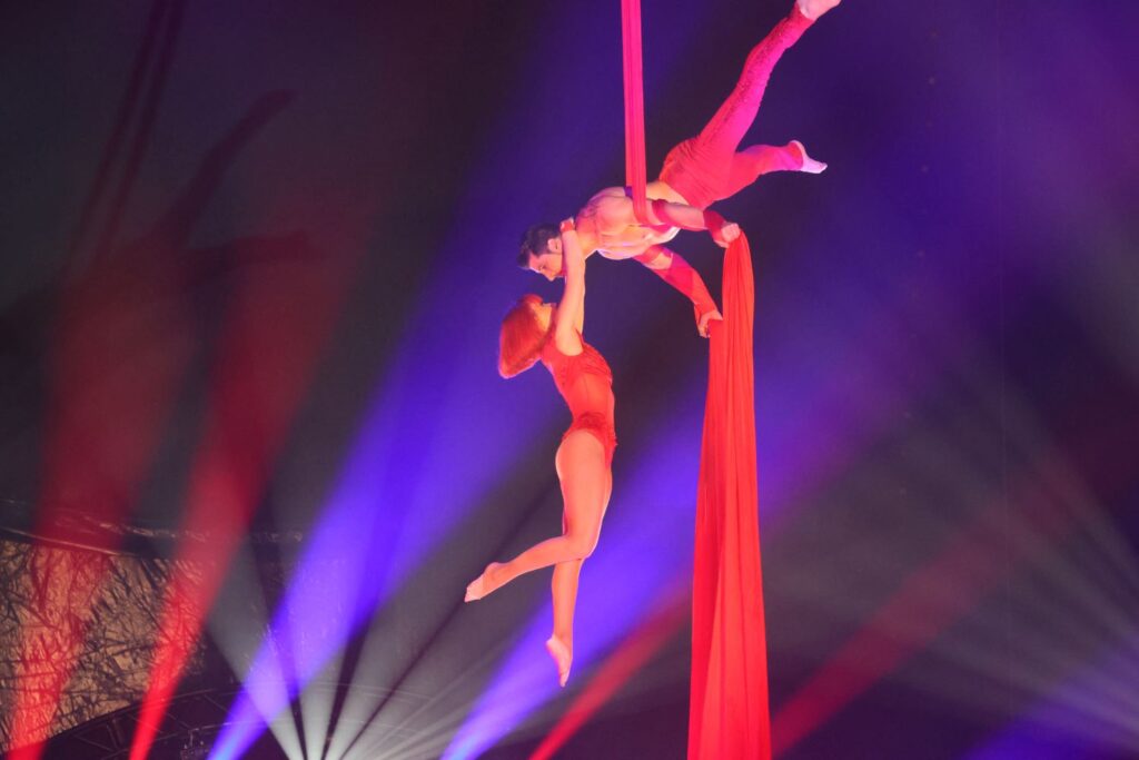 Hatte Kevin Gruß die Zuschauer*innen mit seiner Bungee-Show begeisterte, wurde das nochmal gesteigert, als er und seine Frau Julia ganz in rot gekleidet an die Strapaten gingen. Mit den ebenfalls roten Tüchern gestalteten sie eine atemberaubende Luftakrobatik-Nummer, die sie mit emotionalen und eleganten Einlagen ergänzten.