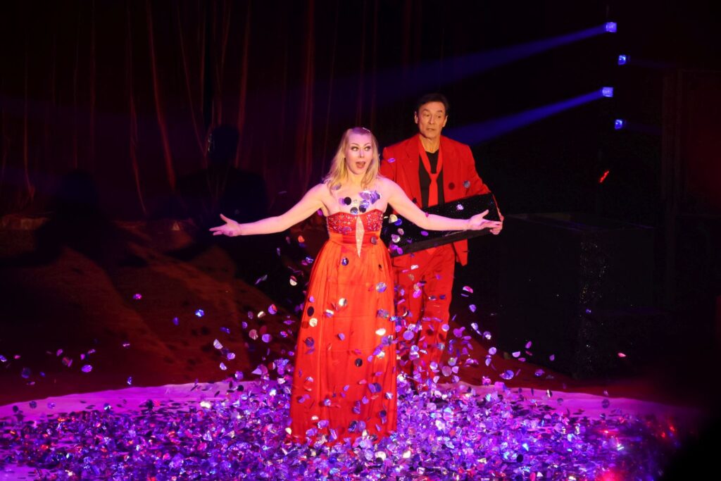 Gleich zu Beginn empfingen alle Artisten gemeinsam die Zuschauer*innen im Zelt, bevor dann die Manege allein dem Duo Monastersky gehörte. Ihre Kunst ist das Quick Change, das blitzschnelle Umziehen, und das ist wörtlich zu verstehen. Denn Alexander und Tatjana wechselten in sekundenschnelle ihre Kostüme, fast als würden sie zaubern.