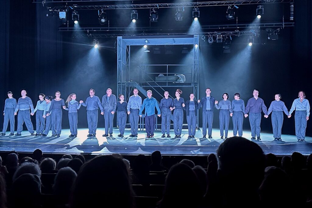 Am Ende sind alle dem Nashornwesen verfallen: das Ensemble mit Statisten beim Applaus nach der Ionesco-Inszenierung im Schauspielhaus. Foto: bikö