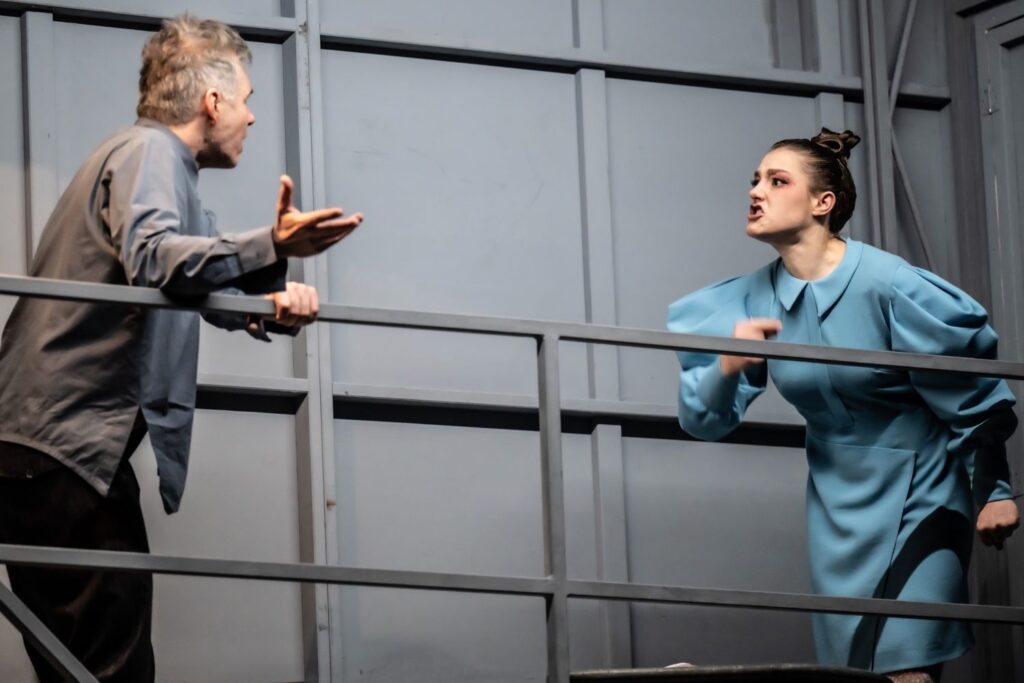 Die letzten Menschen in einer Welt voll Nashörner streiten sich: Bérenger (Heiko Raulin) kann seine Freundin Daisy (Sophie Stockinger) nichtr überzeugen, ein Mensch zu bleiben. Foto: Sandra Then / Schauspielhaus Düsseldorf