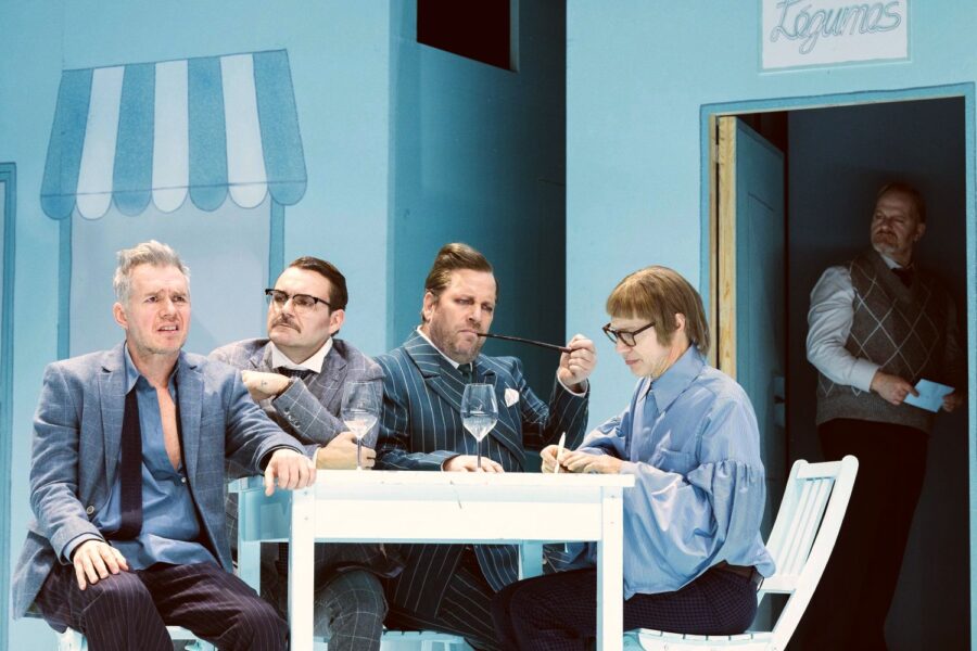 Kein Zufall, dass hauptsächlich ältere Leute zur Premiere kamen. Das absurde Theater ist ja schon Geschichte – wie das Deklamieren kurioser Texte, das langsame eigene Denken und Telefonapparate mit Schnüren. Einen zeitraubenden Streit über die Frage, ob nun das asiatische oder das afrikanische Rhinozeros zwei Hörner hat, würde es nicht mehr geben. Das Netz weiß ja alles. Sofort. Die Inszenierung spielt daher in einer seltsam steifen Retro-Welt.