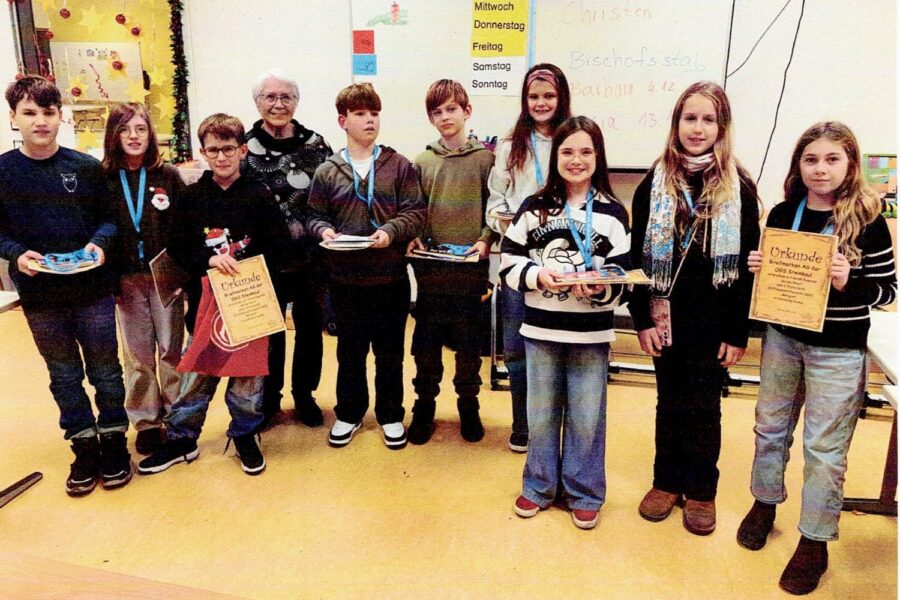 Als spannendes Projekt beteiligten sich die Schüler*innen am Stiftungswettbewerb ,,Religion” der Deutschen Philatelisten-Jugend in Hamburg. Dafür erstellten sie ein Exponat mit Namen ,,Arche Noah”. Die Arbeit der Himmelgeister Kinder überzeugte die Jury und wurde mit dem zweiten Platz belohnt. Abshof de Cals nahm stellvertretend die Urkunden für die Kinder in Hamburg entgegen und übergab sie dann in einer Feierstunde an die Mitglieder der AG.