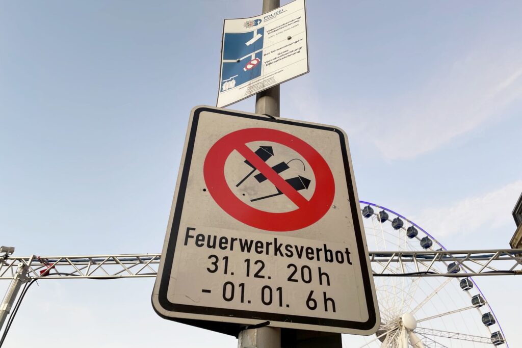 In der Düsseldorfer Altstadt weisen Schilder auf das Feuerwerksverbot hin