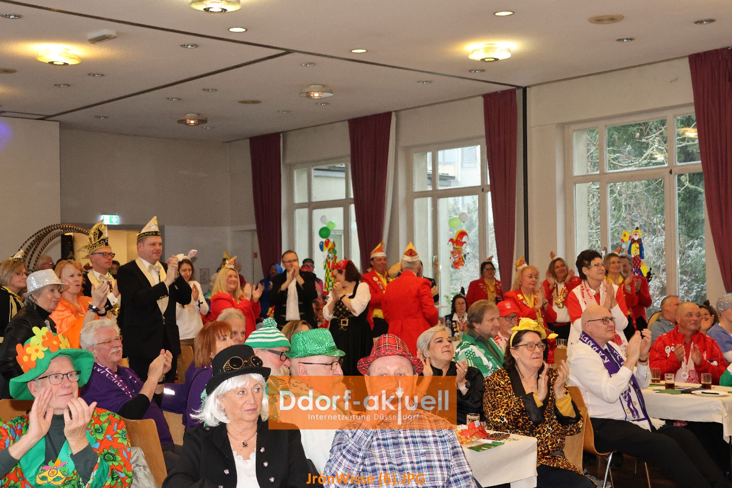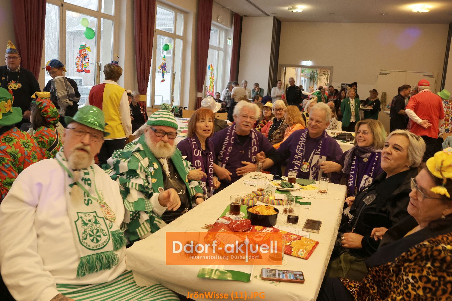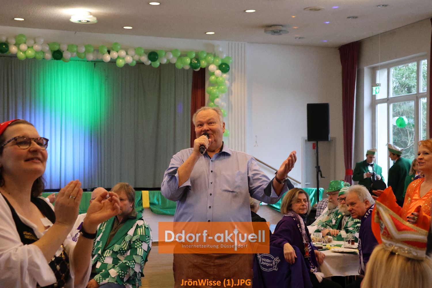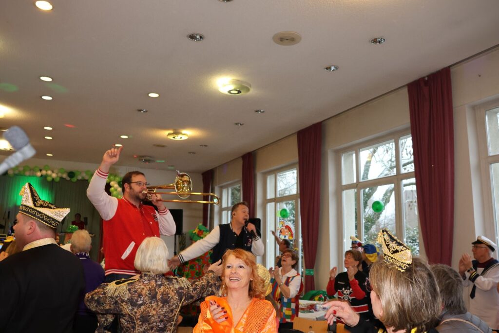 Nachdem sich die Gaststätte Franz Ratte auf der Gumbertstraße definitiv als zu klein für die beliebte Veranstaltung erwiesen hatte, luden die Jrön-Wisse diesmal in den Mirjam-Saal an der Schloßallee ein. Ein gute Entscheidung, denn der Saal war voll und durch Bühne und Parkett davor gab es für alle Auftretenden gute Bedingungen. Dazu trug die Stimmung der Gäste bei, die auch durch ihre Kostüme zeigten, dass sie bereits in Karnevalsstimmung waren.