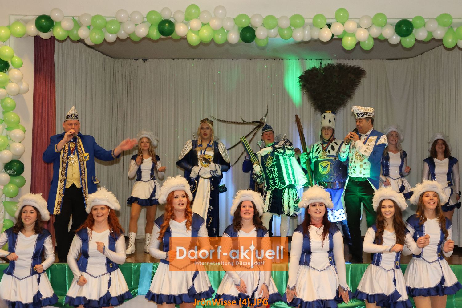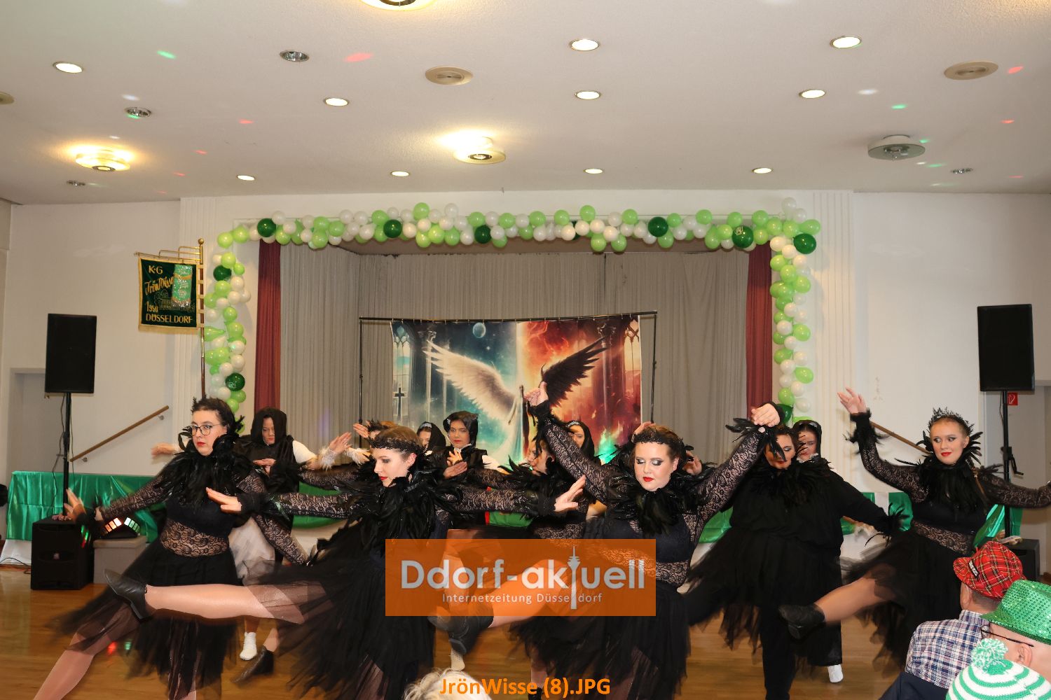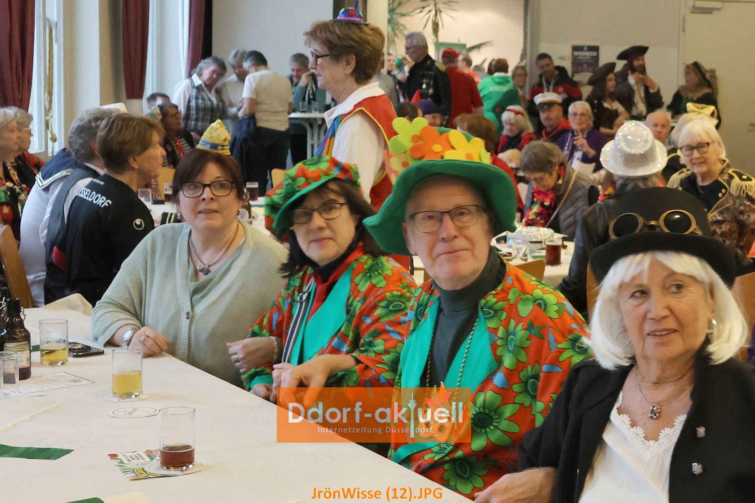 Nachdem sich die Gaststätte Franz Ratte auf der Gumbertstraße definitiv als zu klein für die beliebte Veranstaltung erwiesen hatte, luden die Jrön-Wisse diesmal in den Mirjam-Saal an der Schloßallee ein. Ein gute Entscheidung, denn der Saal war voll und durch Bühne und Parkett davor gab es für alle Auftretenden gute Bedingungen. Dazu trug die Stimmung der Gäste bei, die auch durch ihre Kostüme zeigten, dass sie bereits in Karnevalsstimmung waren.