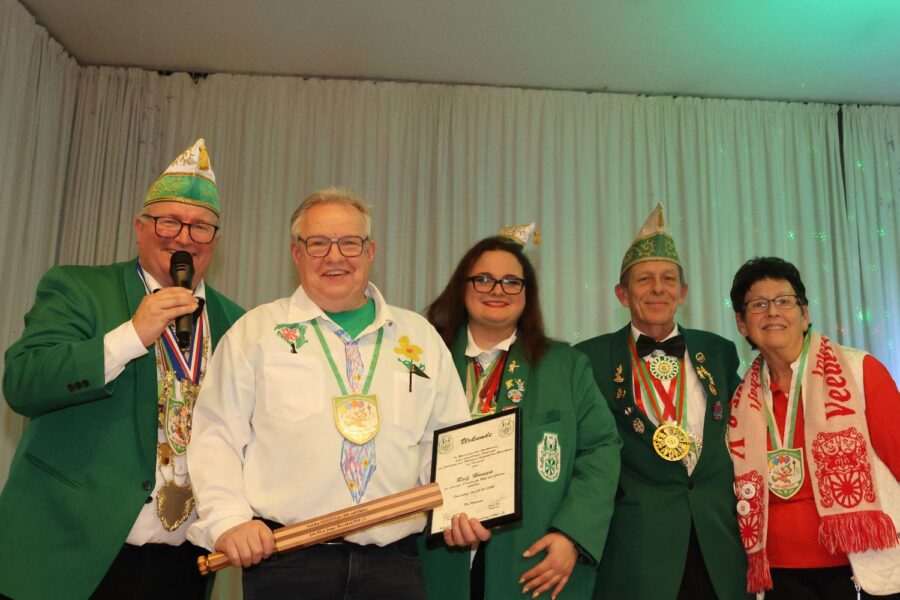 Für einen Gast im Saal war der Jecke Auftakt eine ganz besondere Veranstaltung. Denn traditionell verleihen die Jrön Wisse die Pritsche an einen Menschen „für langjährigen Verdienste zu Erhaltung und Förderung des heimatlichen Brauchtums“. Im vergangenen Jahr wurde Lothar Adams geehrt, der eigentlich die Laudatio auf seinen Nachfolger halten sollte. Da er verhindert war, hielt Madeleine Use die Rede auf Ralf Hansen, den diesjährigen Pritschenträger. Hansen nahm sichtlich gerührt die Auszeichnung entgegen und freute sich, dass sein vielfältiges Engagement so gewürdigt wird.