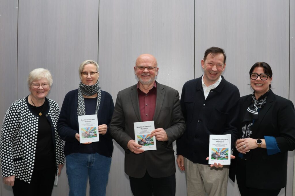 (v.l.) Heidi Reich, Emma Haker, Klaus Lorenz, Burkhard Hintzsche und Melina Schwanke mit der dritten Auflage des Stadtteilkompass Wersten
