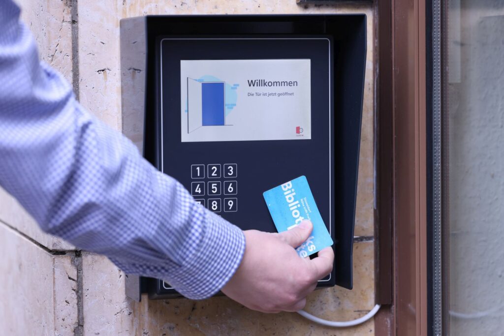 Das Lesegerät am Eingang überprüft die Bibliothekskarte und gibt dann den Zugang zur Stadtteilbücherei Unterbach frei, Foto: Stadt Düsseldorf, David Young