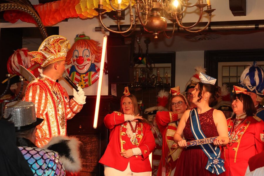 Anschließend erfuhren die Karnevalisten, dass Prinz Marcus I. in der gerade erst begonnenen Session bereits Federn gelassen hat. Das erzählten er und seine Venetia Nicole lachend. Mit 1,95 Meter ist die Tollität sowie schon groß. Seine Prinzenkappe mit Federn ist da für manchen Raum oder Bühne eine Herausforderung. Man habe bereits zwei Federn nachkaufen müssen – sicherlich auch, damit bei der am Donnerstag aufgezeichneten Fernsehsitzung alles perfekt aussah.