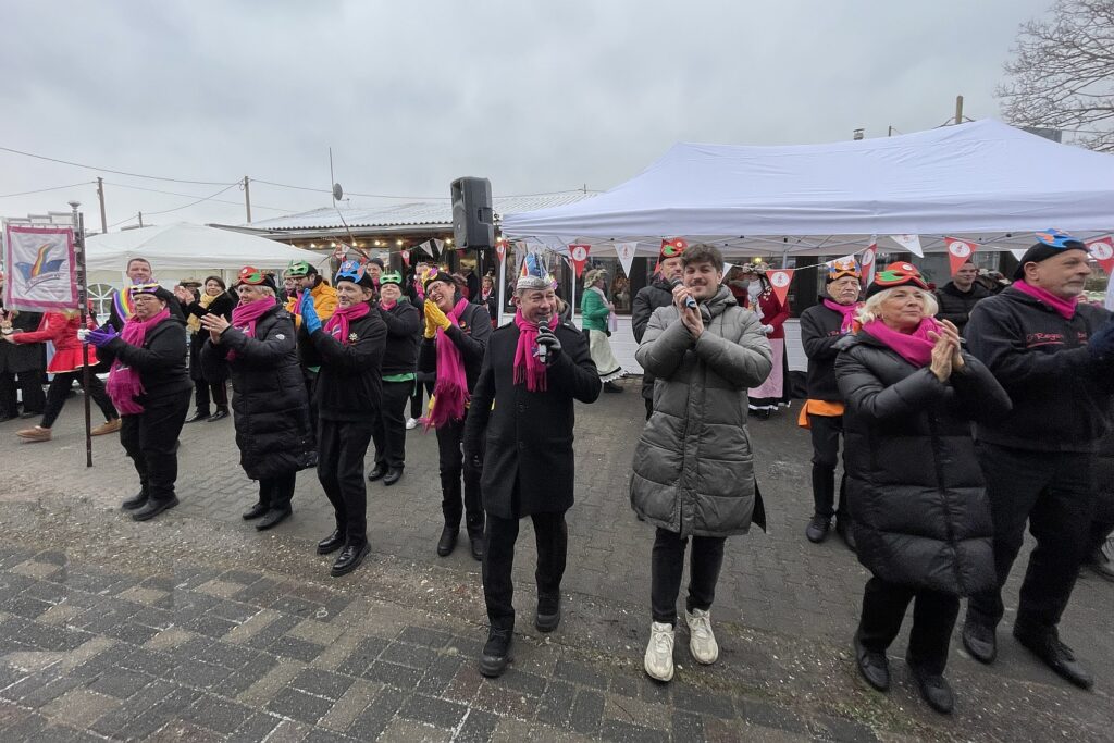 Die bunten Hüte der Marktfrauen leuchteten, im sonst verschneiten Kleingartenverein. Im Gegensatz zum Sellerieprinzen, der sein Ornat tapfer mit Strumpfhosen trug, konnten die Marktfrauen unter ihren Röcken wärmende Unterkleider und dicke Schuhe tragen. Die zahlreichen Tänzerinnen der verschiedenen Garden absolvierten ihr Programm auf dem kalten Untergrund. Sie verzichteten zwar auf akrobatische Einlagen und Spagat, aber brachten mit ihren Tänzen so viel Schwung in das Biwak, dass auch den Gästen warm wurde.