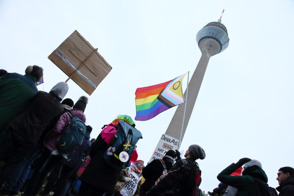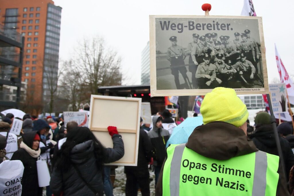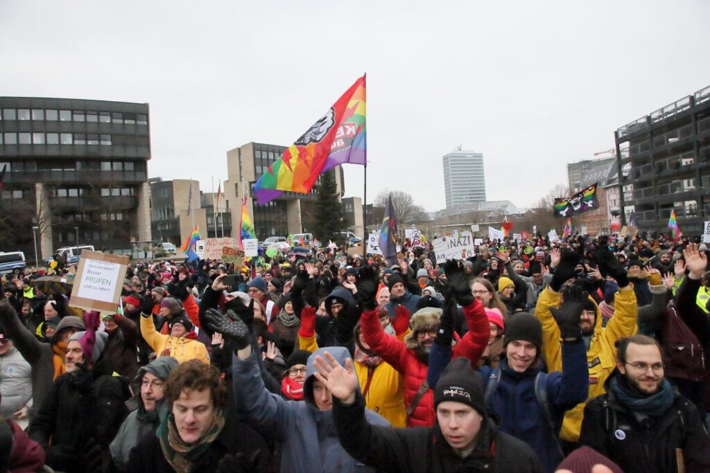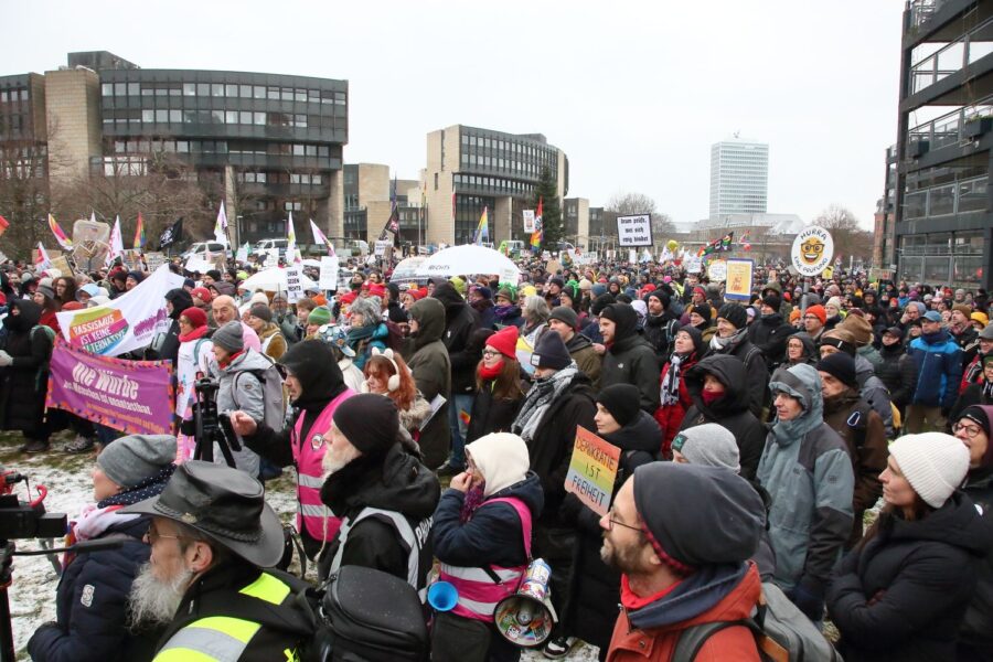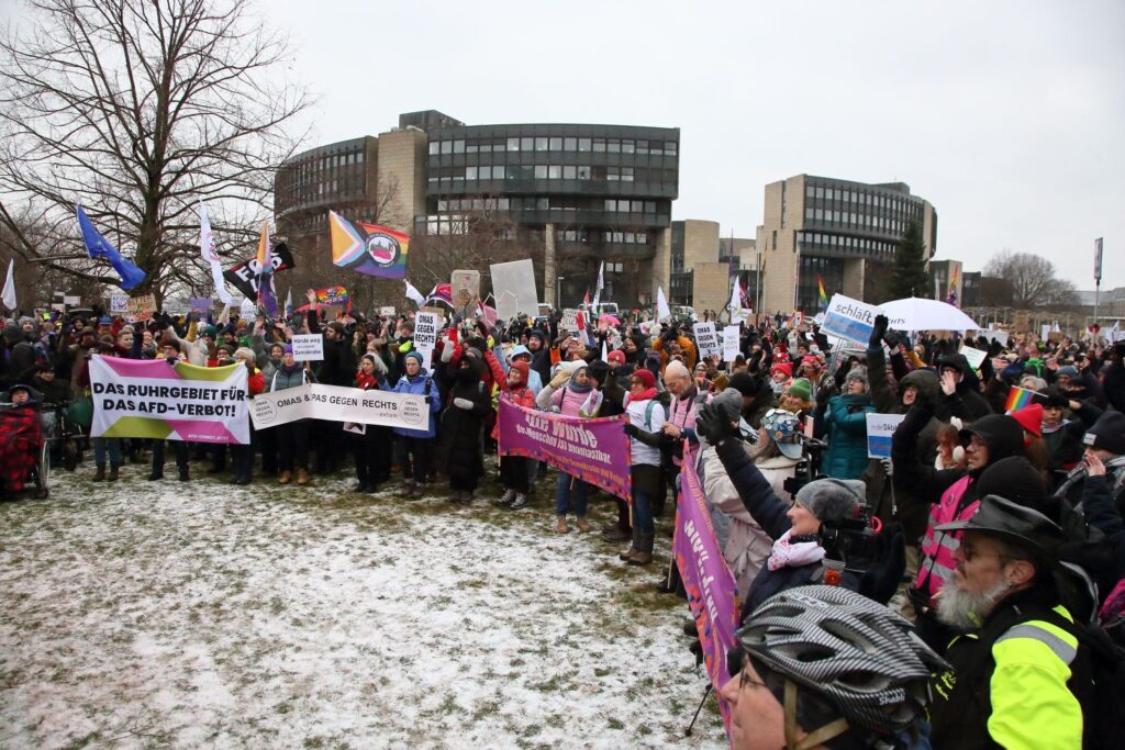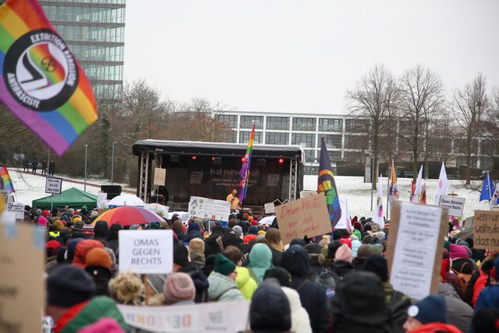 Die winterlichen Temperaturen hielten rund 3000 Menschen am Samstag (10.1.) nicht davon ab, vor dem Landtag in Düsseldorf ihre Forderung lautstark zu formulieren: „Alle Parteien, die vom Verfassungsschutz als rechtsextremer Verdachtsfall oder gesichert rechtsextrem eingestuft werden, sollen durch das Bundesverfassungsgericht überprüft werden.“
