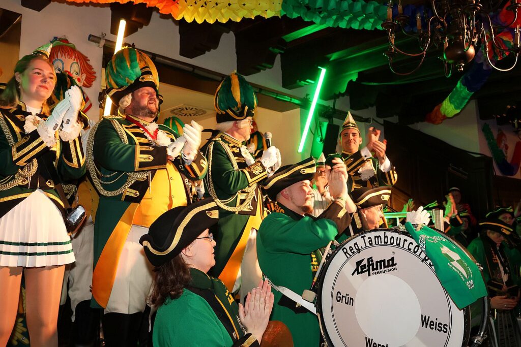 Die Ehrengarde wurde musikalisch aus Wersten vom Tambourcorps Grün-Weiss verstärkt. Gemeinsam mit Sänger Eric Stephan gestalteten sie den Auftakt am Samstagabend (10.1.). Bunt kostümierte Gäste stimmten auch begeistert bei der Musik der Band Tante Käthe mit ein.