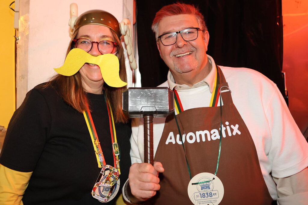 Die Gäste der Bürgersitzung der Hoppediz-Wache sind Jahr für Jahr gespannt, welches Motto sich der Vorstand wieder hat einfallen lassen. Präsidentin Rafaela Kaiser und der 1. Vorsitzende Markus Schäfer waren bis kurz vor der Sitzung bemüht, das auch geheim zu halten. Doch als die ersten Jecken am Samstagabend (10.1.) in die Fassabfüllung der Brauerei Schumacher kamen, gaben bereits ein Wildschwein und ein Lagerfeuer auf der Bühne erste Hinweise auf ein gallisches Dorf. Blieb nur die gespannte Frage, wer Asterix und wer Obelix sein würde? Und würde jemand die Rolle des Barden Troubadix übernehmen – wo singen bei den Hoppedizen doch dazu gehört.