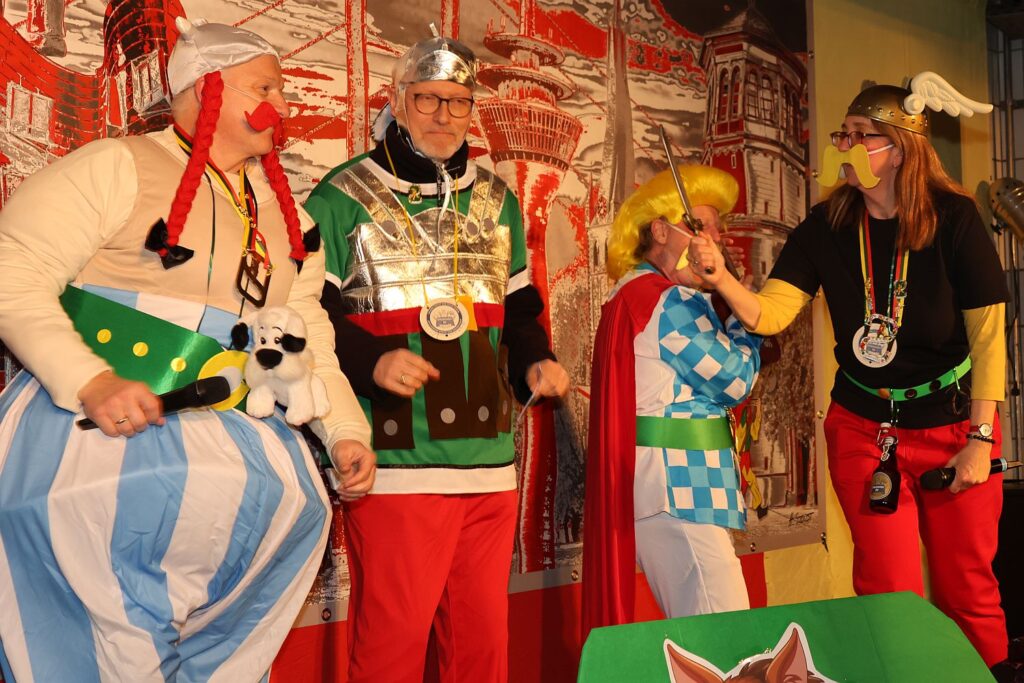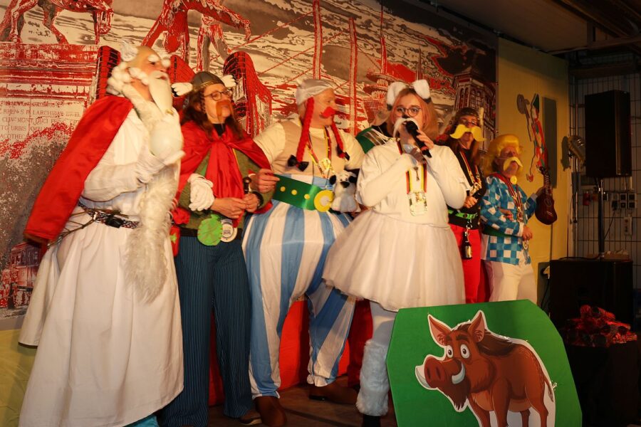 Unter großem Applaus zogen die Gallier ein: Asteric alias Rafaela Kaiser, Obelix alias Markus Schäfer, Miraculix alias Katrin Bühl, Majestix alias Katharina Conen und Michael Martsch als Troubadix. Beim traditionellen Eröffnungslied kam Et Nina als Idefix noch dazu und natürlich ist die Hoppediz-Wache tolerant und ließ auch einen Römer mitfeiern.