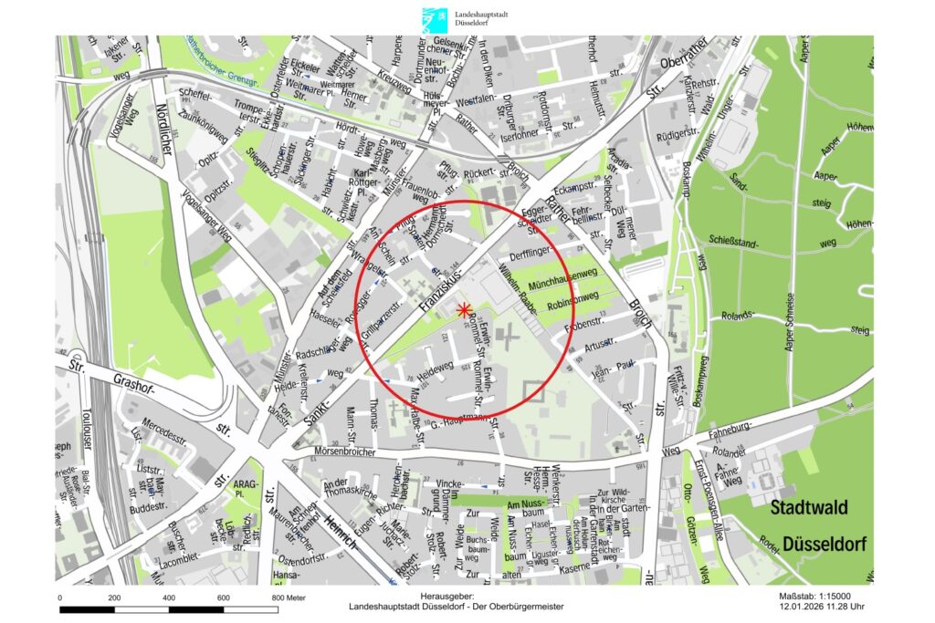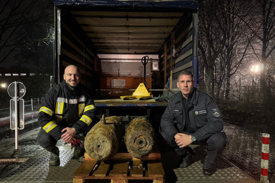 Im Bereich eines Spielplatzes und eines Sportplatzes wurden am Montag (12.1.) bei Sondierungsarbeiten zwei britische Fünf-Zentner-Fliegerbomben aus dem Zweiten Weltkrieg gefunden. Da die Entschärfung zeitnah erfolgen sollte, wurde der Gefahrenbereich mit einem Radius von 400 Metern rund um den Fundort an der Sankt-Franziskus-Straße ab 16 Uhr gesperrt. Bis zu 4.200 Menschen mussten ihre Wohnungen verlassen.