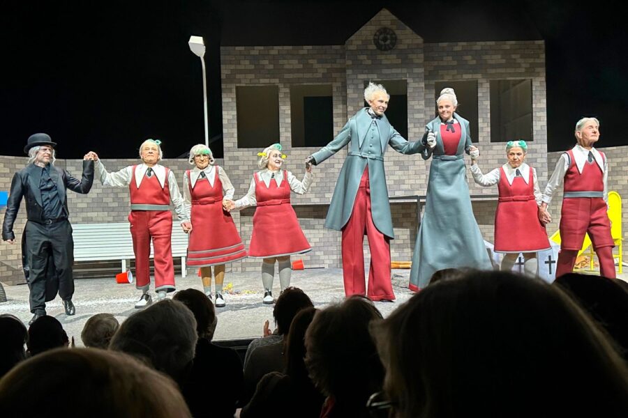 Ob das nun lustig oder traurig sein soll, weiß der Autor/Regisseur wahrscheinlich selbst nicht genau. Es hat auf jeden Fall etwas Rührendes, denn die älteren Herrschaften in surrealen Schuluniformen sind Laiendarsteller mit eher zartem Temperament. Es gab bei der Premiere einige Texthänger, die Souffleuse musste sehr laut vorsagen, man litt mit. Souverän agierten indes die jungen Profis Caroline Cousin und Valentin Stückl als jeweils zwei Mütter und Lehrer mit ausgestopftem Greisenbuckel und erschwerten Bedingungen, da sie wegen der Bedeutungsgröße auf Stelzen laufen mussten.
