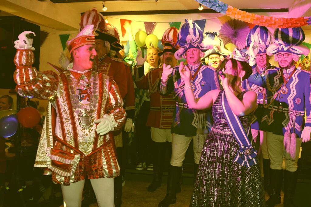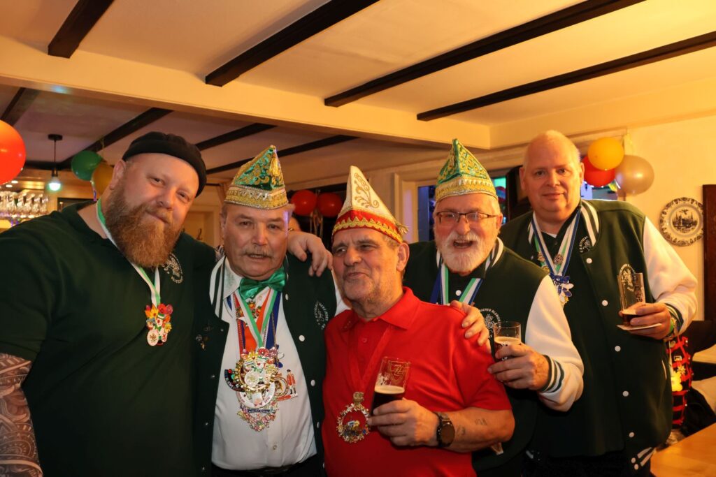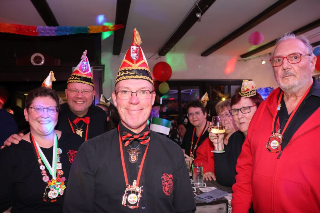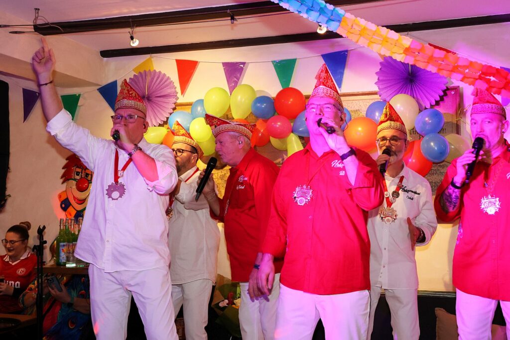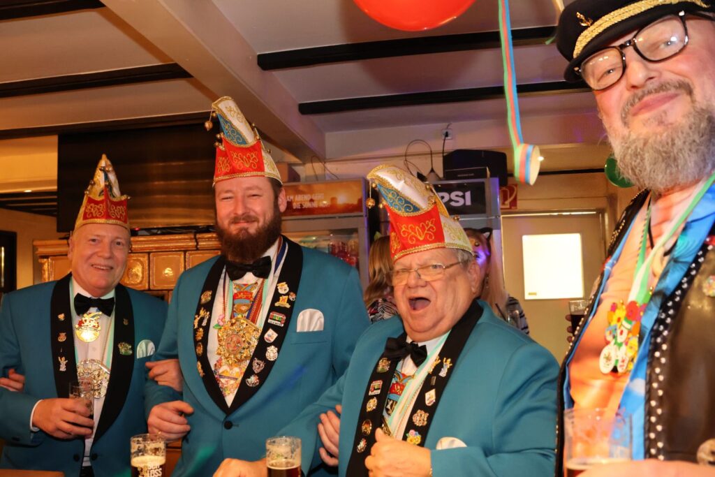 In die gute Stimmung tauchten die Sänger von Hahnenschrei ein, die als Zugabe eine Polonaise durch die Gaststätte ziehen ließen. Das beobachtete auch das Prinzenpaar mit Adjutantur, die anschließend mit geschwungenen Fähnchen empfangen wurden. Prinz Marcus I. hatte vorsorglich schon seine Kappe mit Federn gegen das schlichte Modell eingetauscht, denn auf seine Körpergröße von 1,95 Metern plus Prinzenkappe sind viele Bühne einfach nicht ausgelegt.