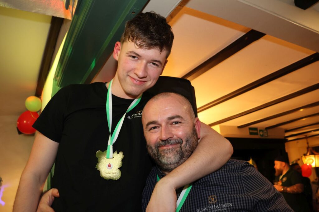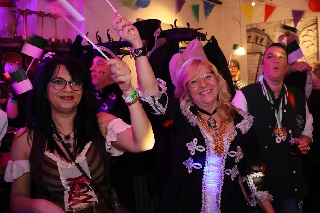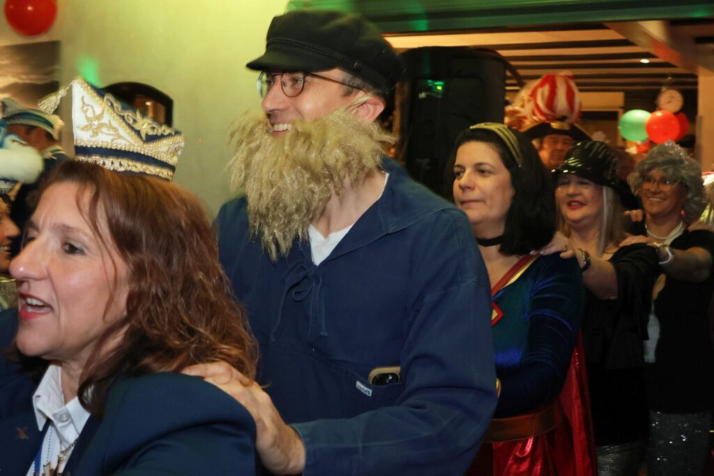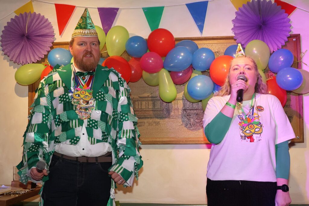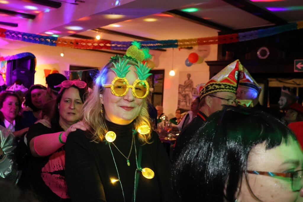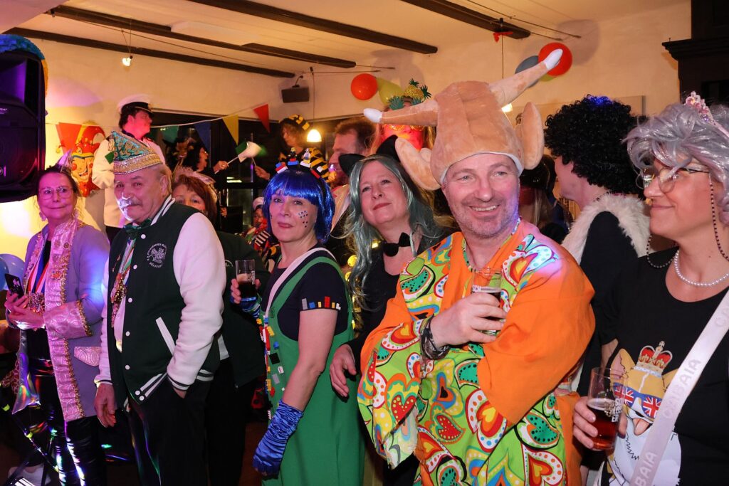 In die gute Stimmung tauchten die Sänger von Hahnenschrei ein, die als Zugabe eine Polonaise durch die Gaststätte ziehen ließen. Das beobachtete auch das Prinzenpaar mit Adjutantur, die anschließend mit geschwungenen Fähnchen empfangen wurden. Prinz Marcus I. hatte vorsorglich schon seine Kappe mit Federn gegen das schlichte Modell eingetauscht, denn auf seine Körpergröße von 1,95 Metern plus Prinzenkappe sind viele Bühne einfach nicht ausgelegt.