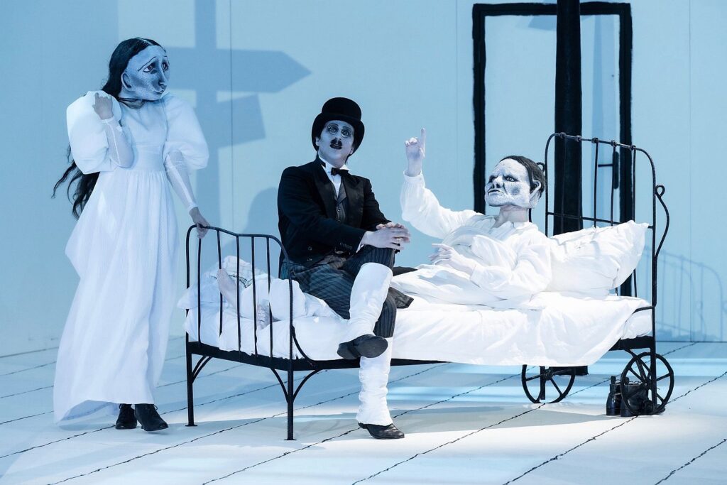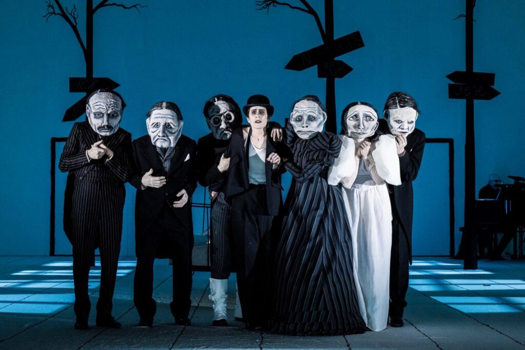 Mummenschanz: In “Kafkas Traum” tritt das Ensemble um Pauline Kästner (Mitte) in der Rolle des Schriftstellers zeitweise mit Masken auf. Foto: Sandra Then / Düsseldorfer Schauspielhaus